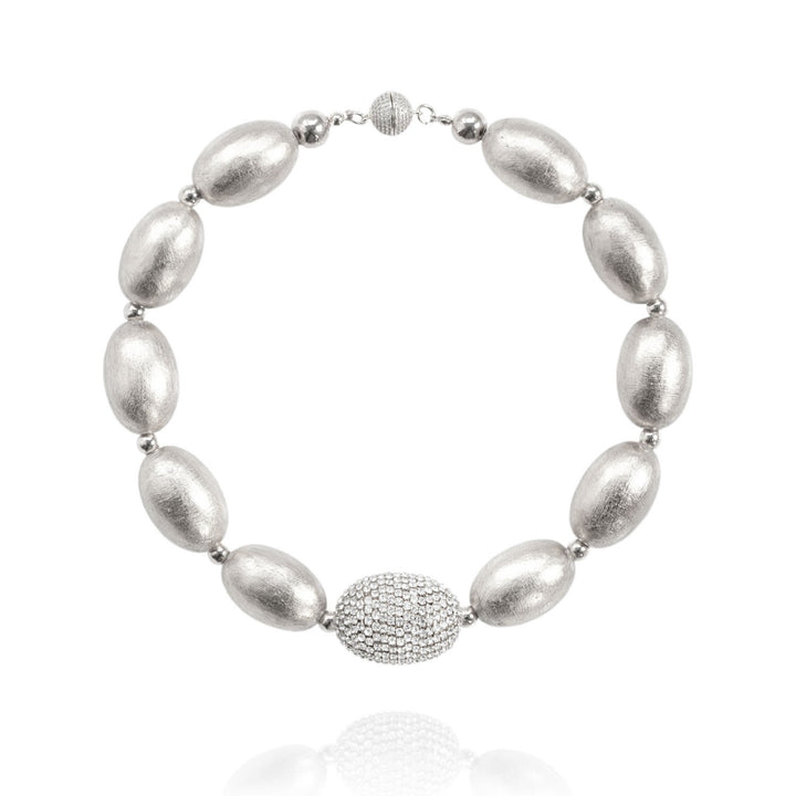 This necklace is handmade from silver foil, crystal rhinestones, hematite beads, and a wood base, with a silver-plated brass magnetic closure.