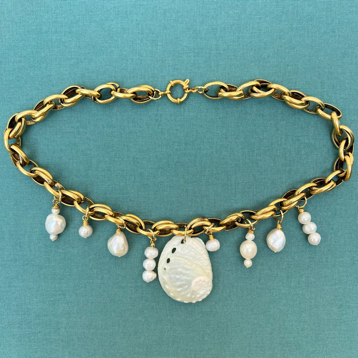 This pendant necklace is crafted from 12k antiqued gold-plated brass with a pearlized abalone shell, freshwater pearl charms, and a 12k gold-plated stainless steel sailor clasp. It is 18 inches long.