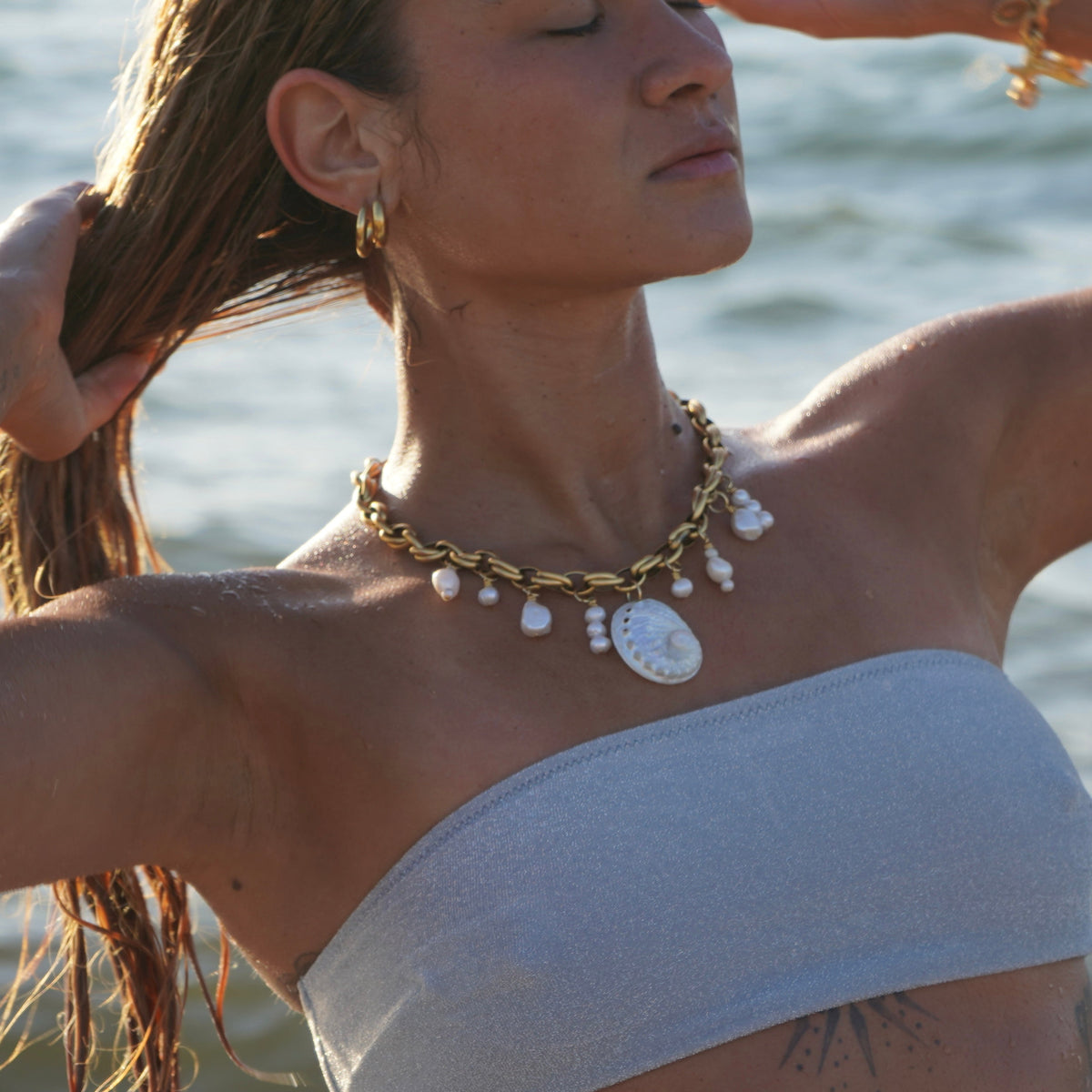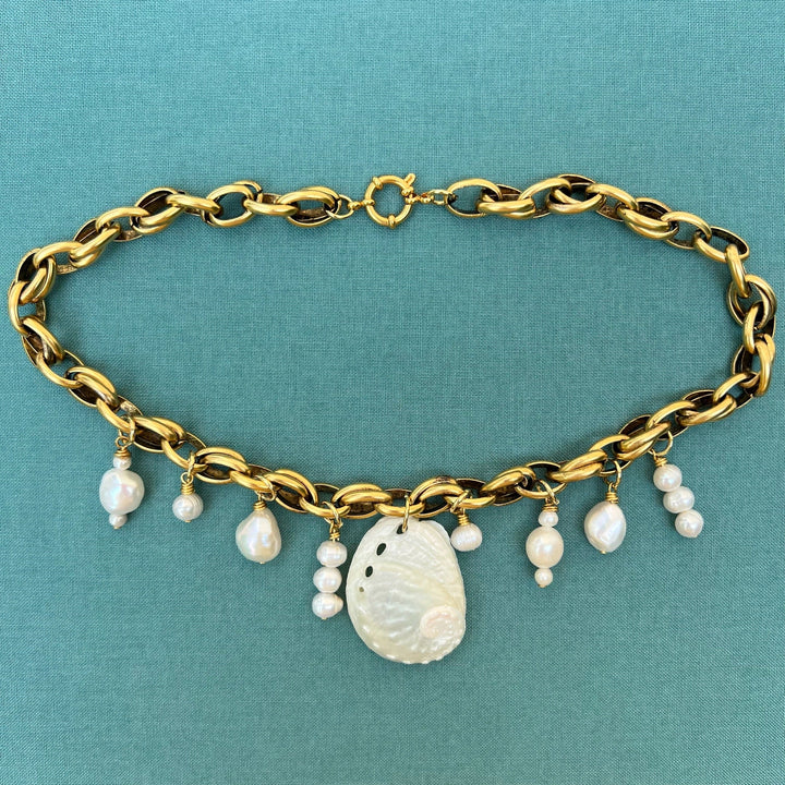 This Cala Pearl & Shell Necklace by Sccollection is a charming and unique accessory. It features a statement pearlized abalone shell from Sardinia and an assortment of hand-wrapped freshwater pearl charms. It is made of 12k antiqued gold-plated brass.