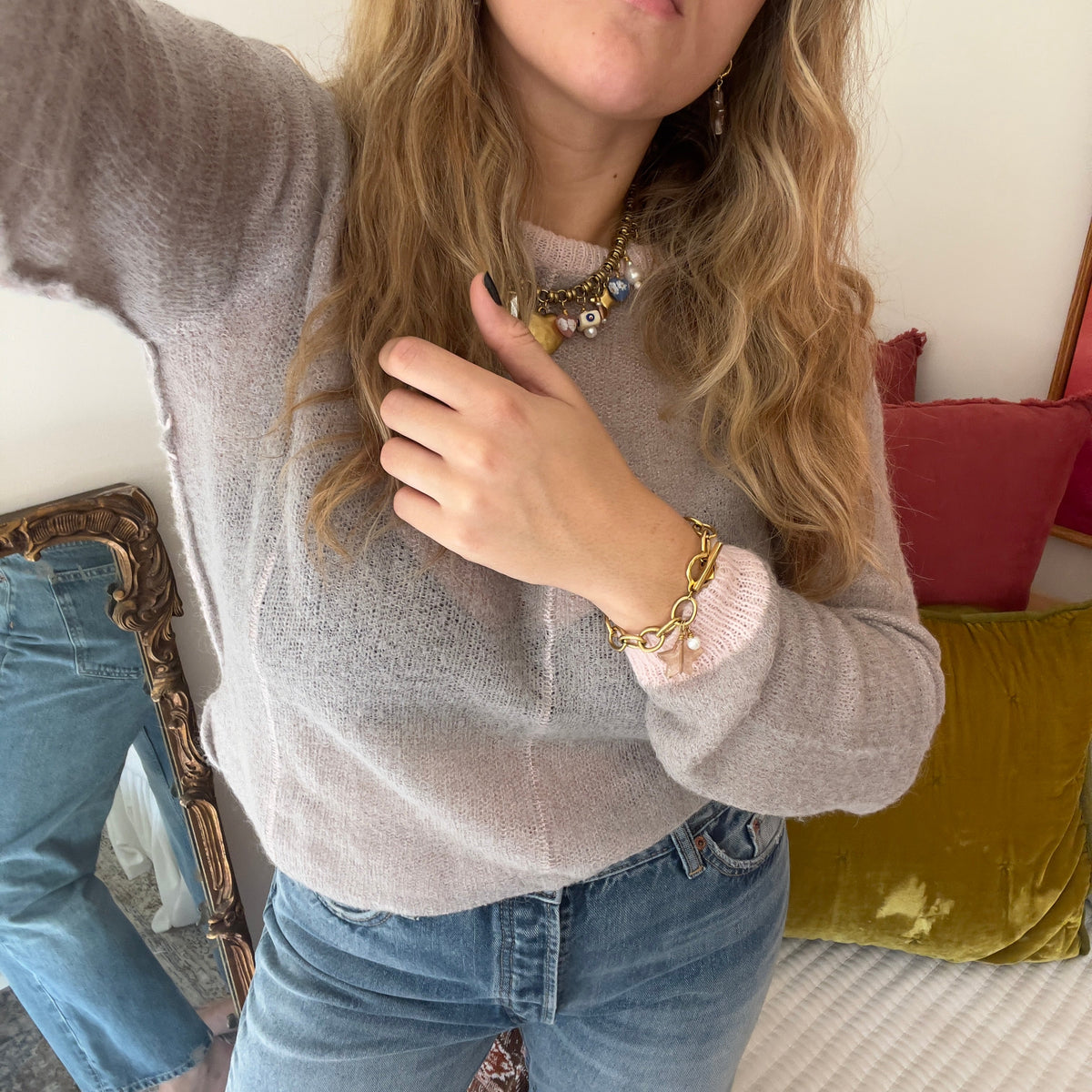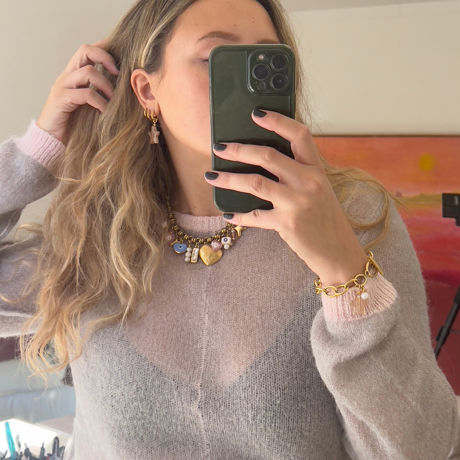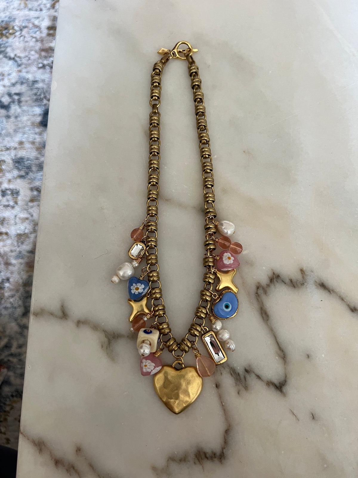 This necklace is crafted from 12k antiqued gold-plated brass. It is 17 inches long and features pink, blue, freshwater pearl, and gold charms. It has a mini toggle clasp.