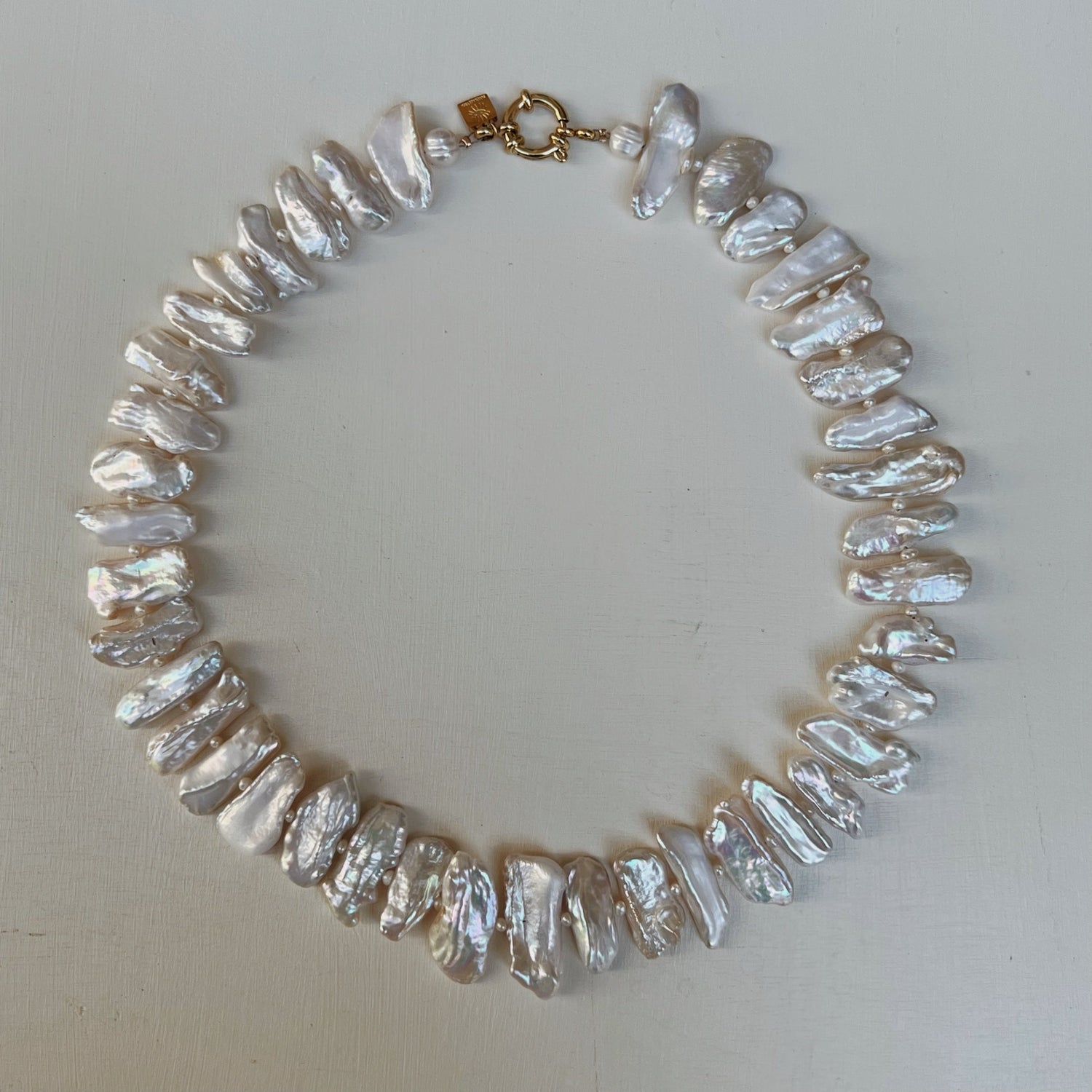 This collar necklace is made of keshi pearls and has a 22k gold-plated stainless steel sailor clasp. It is 17 inches long.