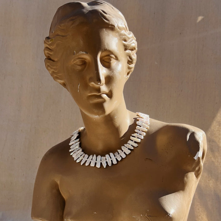 This Cora Pearl Collar Necklace by Sccollection is a glamourous and unique accessory. The necklace features extremely rare and unique keshi pearls, known for their baroque shapes and colorful luster. No two pearls are alike, making this a one-of-a-kind piece with a 22k gold-plated stainless steel sailor clasp.
