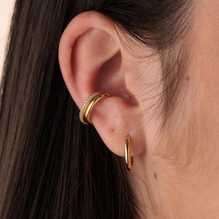 This earring set is made of 18ct Gold Plated Recycled Sterling Silver and features cubic zirconia stones. It includes a pair of large huggie hoops and two ear cuffs.