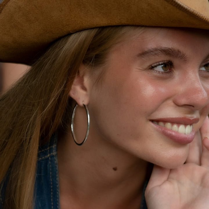The Silver Large Perfect Hoop Earrings by Scream Pretty are a classic and essential staple for any jewelry collection. Inspired by their popular perfect hoop earrings, this super-sized design features elegant curves, a polished band, and a hinged clasp. They are versatile and can transform the simplest of outfits.