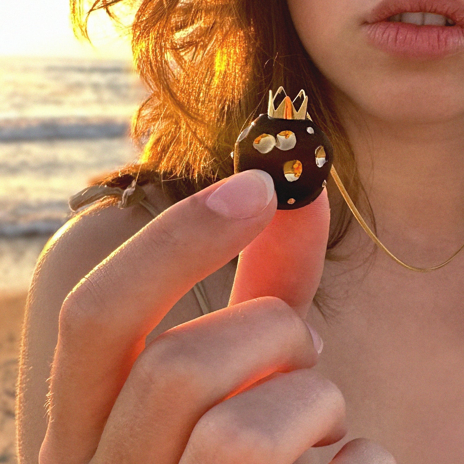 This Queen Of The Night Moon Necklace by Sculp is a magical and exclusive accessory. The necklace features a hand-made porcelain moon pendant with a 24K gold-over 925 sterling silver crown, chain, and details. The Swarovski crystals add a touch of sparkle. This necklace will make anyone happy and will be a timeless piece.