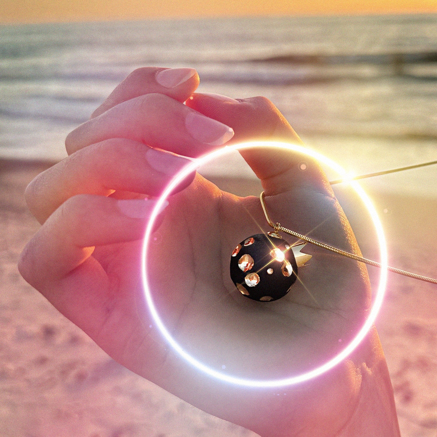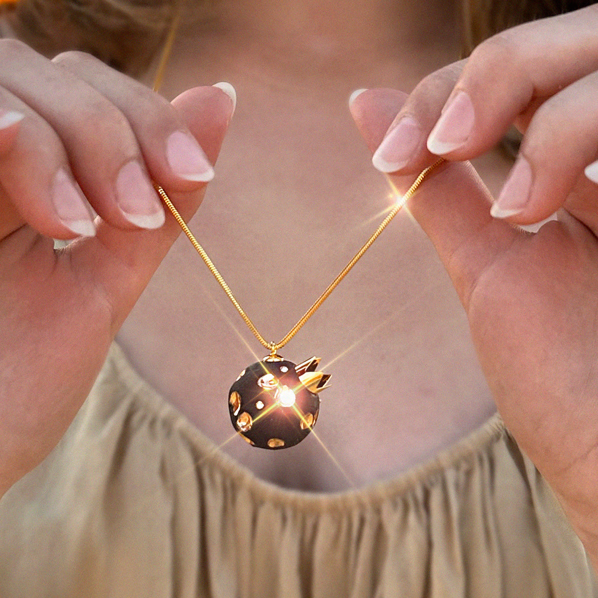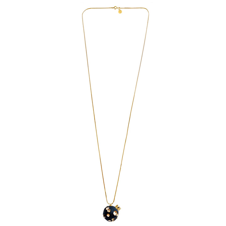 This pendant necklace is crafted with a hand-made porcelain moon pendant, a 24K gold-over 925 sterling silver crown, chain, and details, and Swarovski crystals. To maintain its quality, keep it in the provided cotton bag.