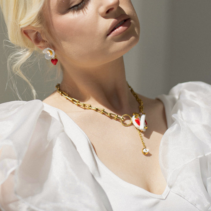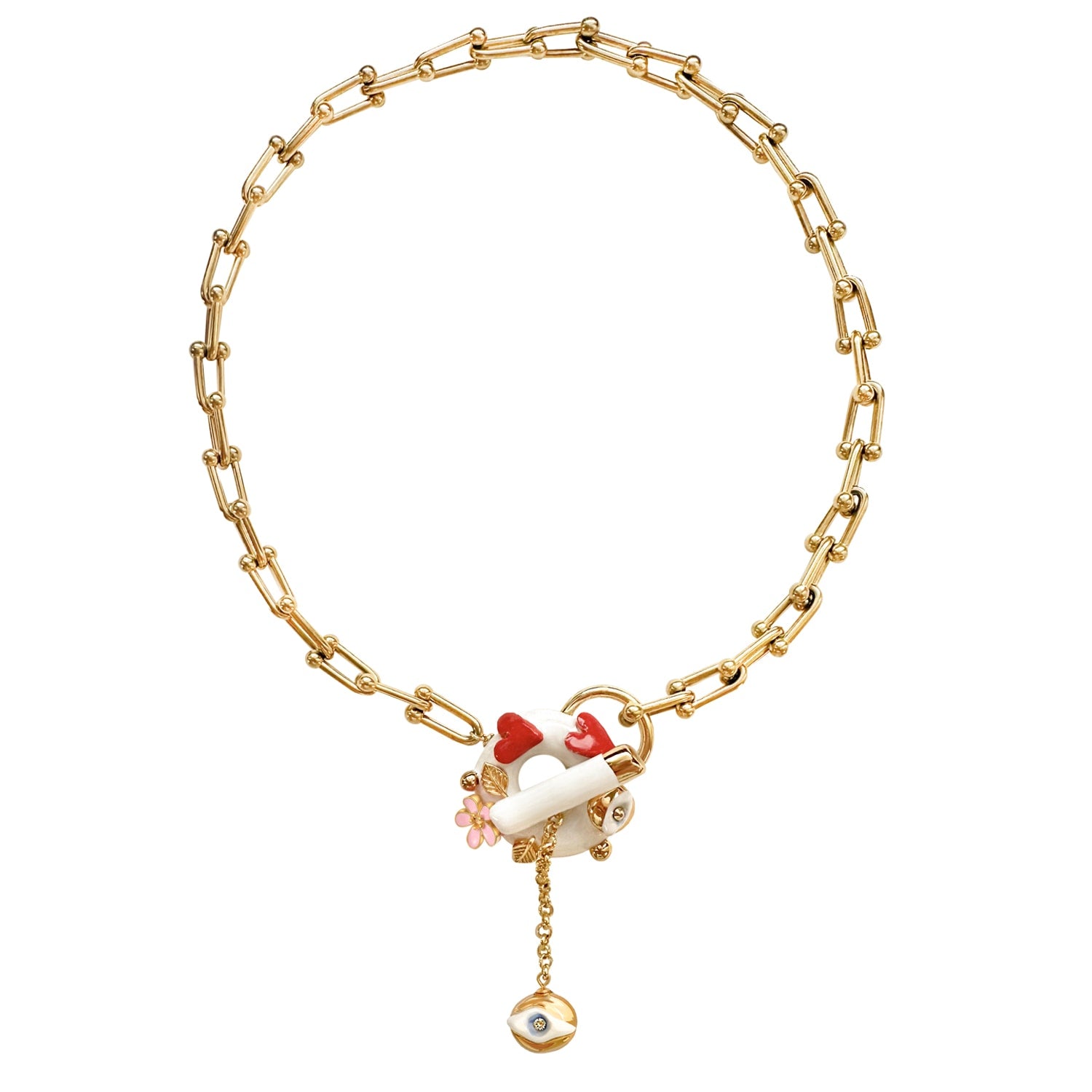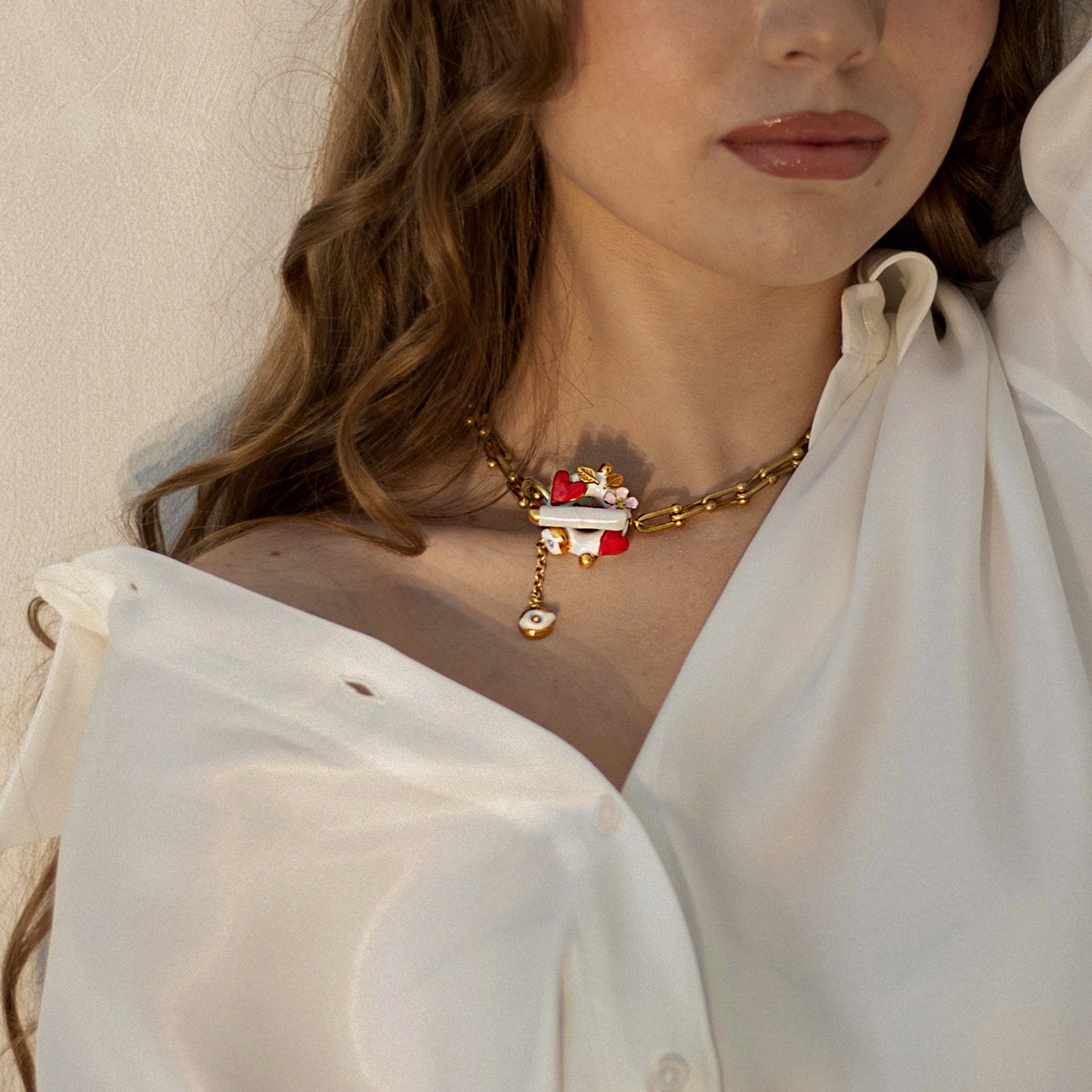 Handcrafted with a porcelain pendant, 24k gold-over 925 sterling silver details, Swarovski crystals, and a gold-colored stainless-steel chain.