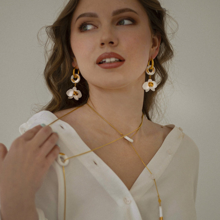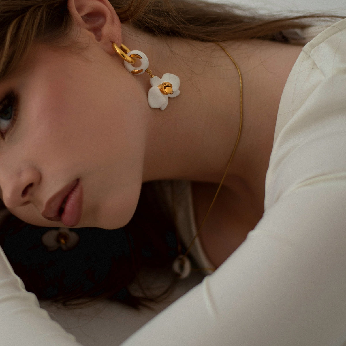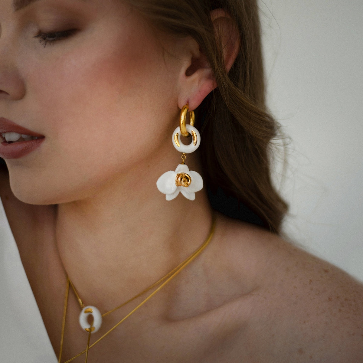 The Dangle Orchid Earrings by Sculp are an exotic and elegant accessory. These dangle earrings are a must-have piece that adds an exotic twist to your look. They are hand-made from porcelain and are very light. They feature a precious 24K gold lustre and a 24K gold-over 925 sterling silver hoop.