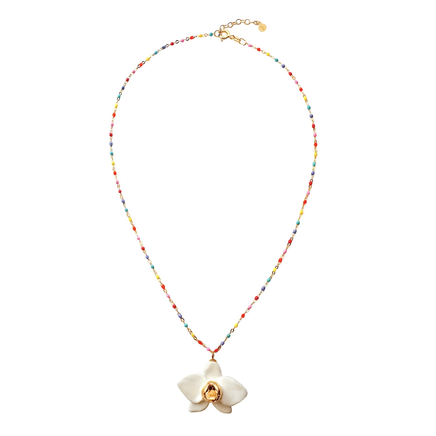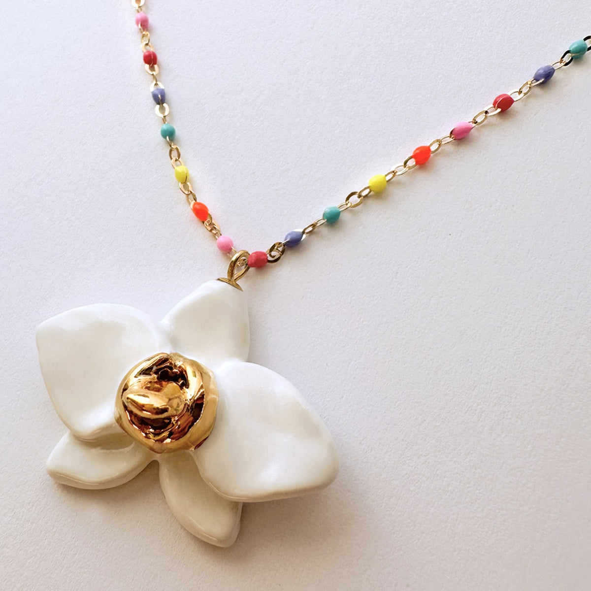 This necklace features a handmade porcelain orchid pendant (2 cm x 3 cm) accented with 24K gold lustre. The chain is 24K gold-over 925 sterling silver.