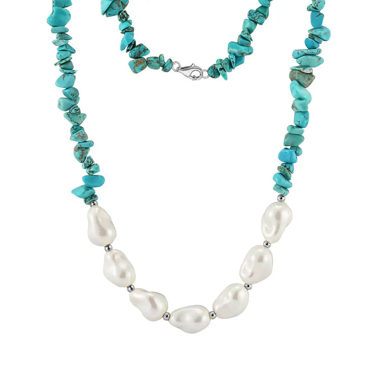 This beaded necklace is made from natural turquoise, freshwater baroque pearls, and solid 925 sterling silver. It is an extra-long, limited-edition piece.