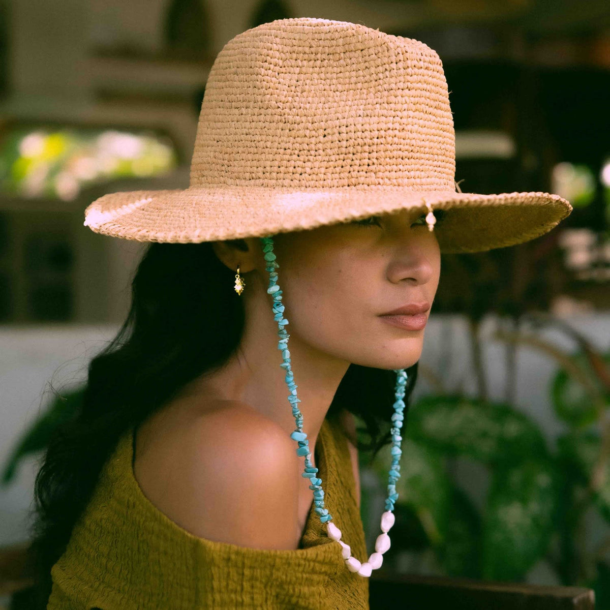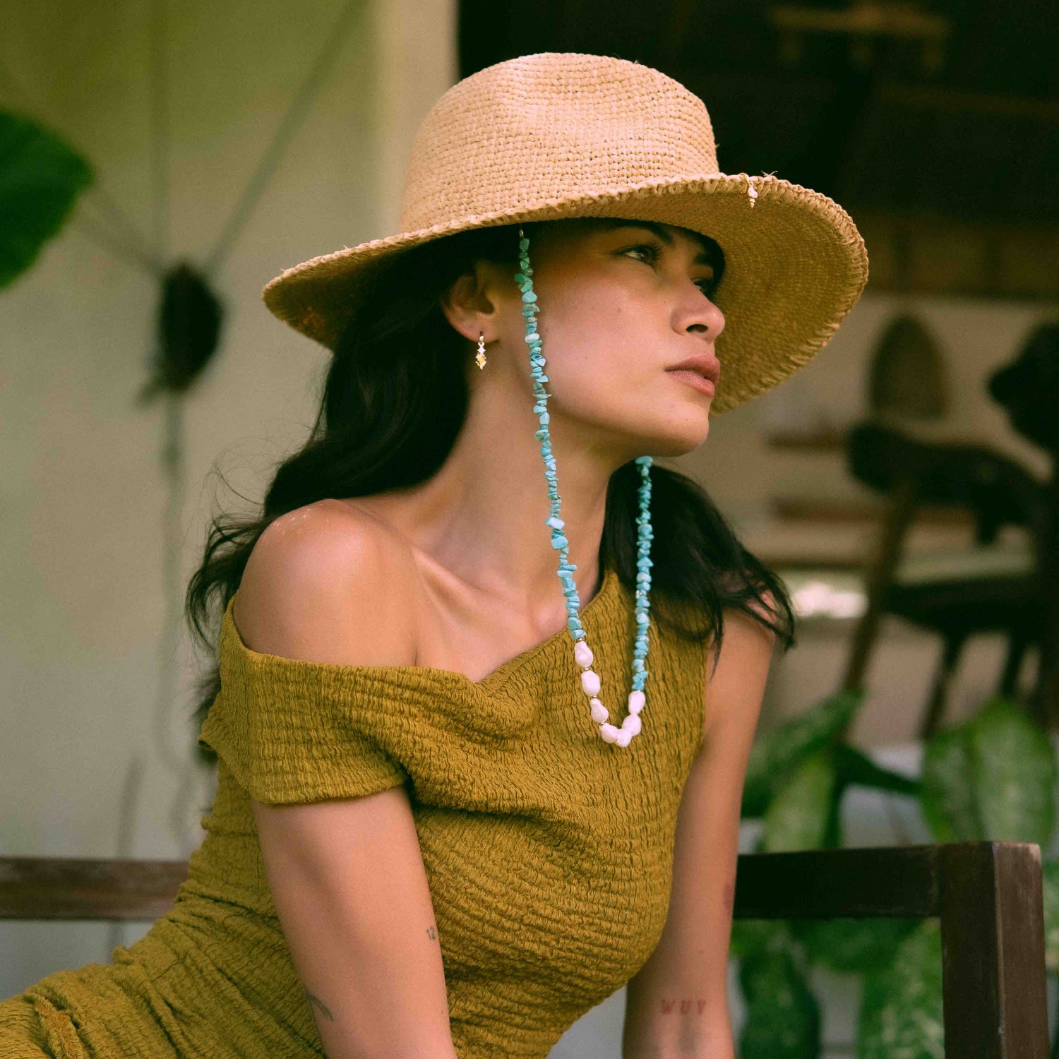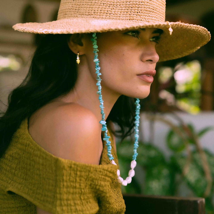 The Oceana Turquoise & Pearl Beaded Necklace by Shaded the Label is a limited-edition piece inspired by the shallows. Crafted from natural turquoise and freshwater baroque pearls, this extra-long necklace can be worn on the neckline or as a headwear accessory. It is made of solid 925 sterling silver and is a unique statement piece.