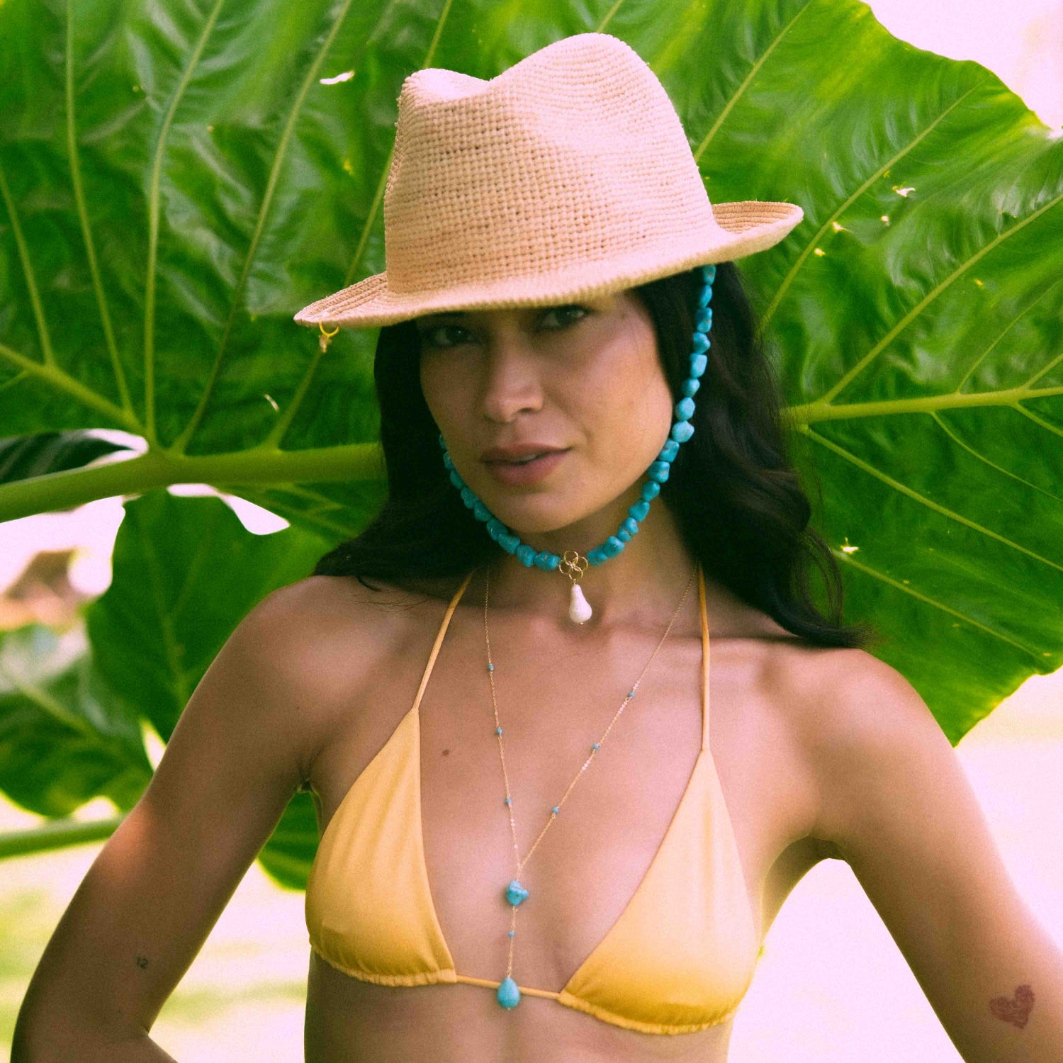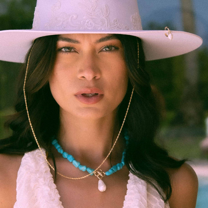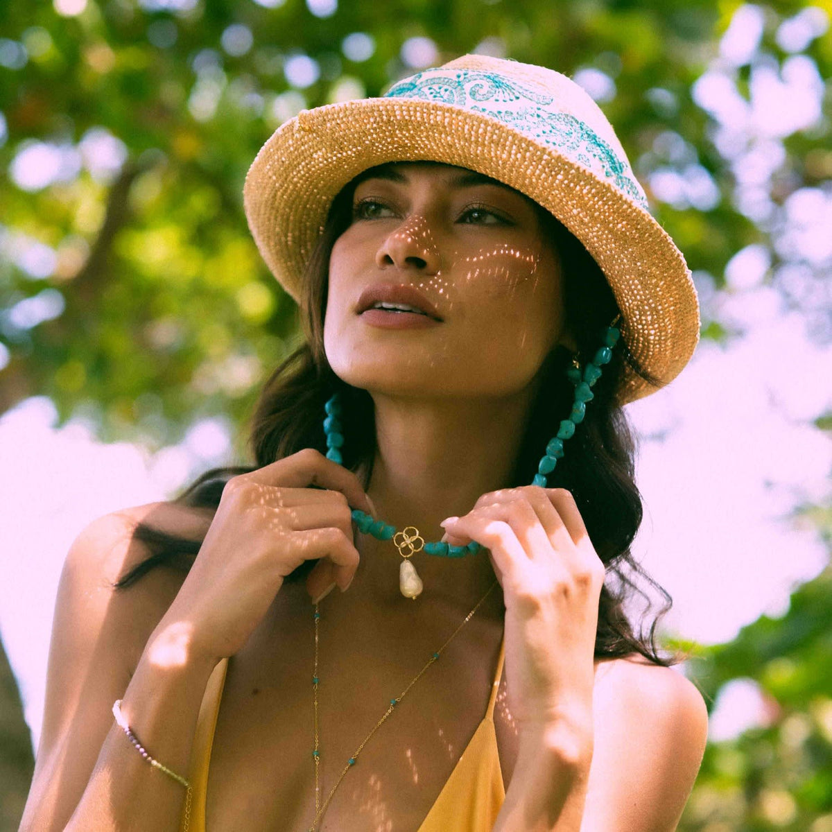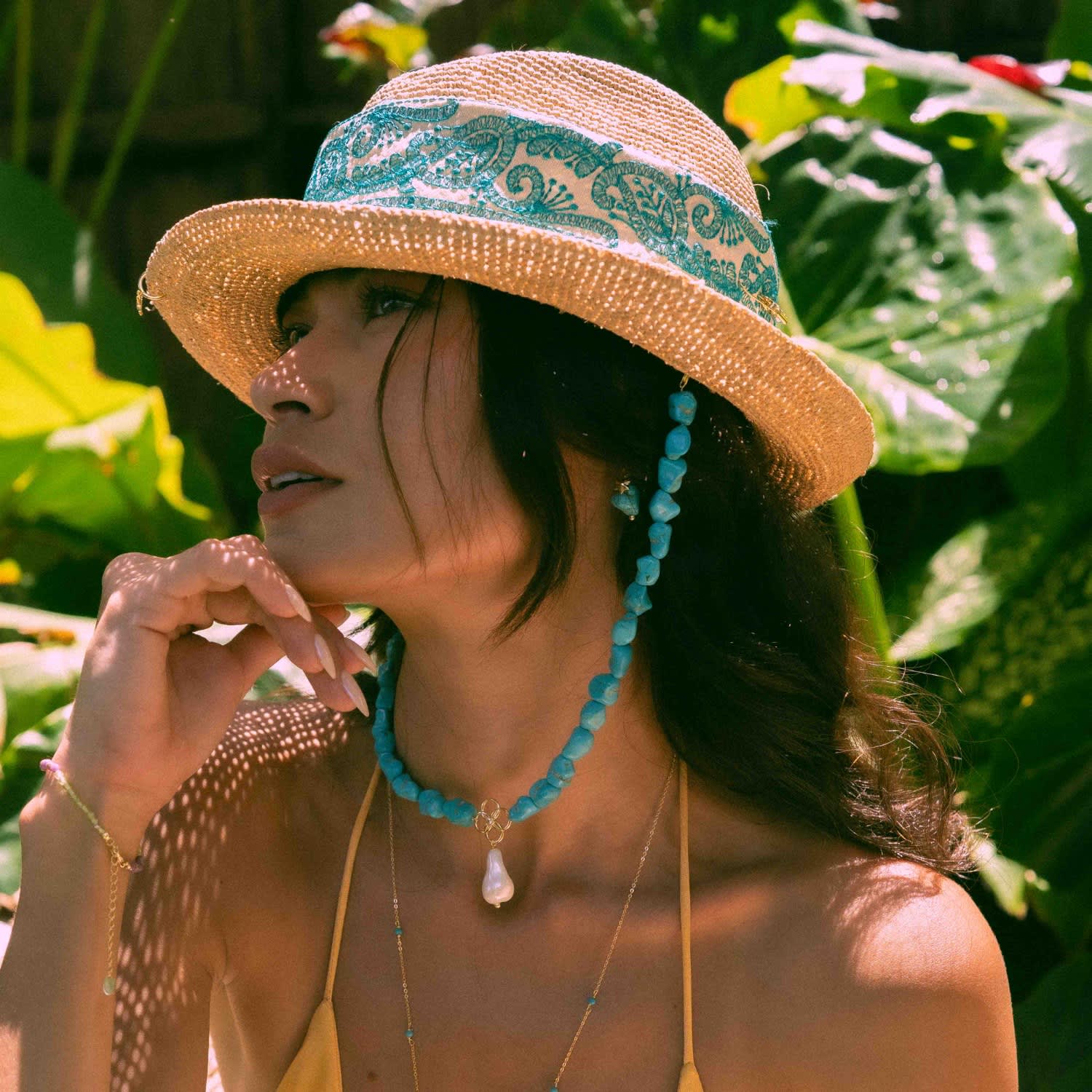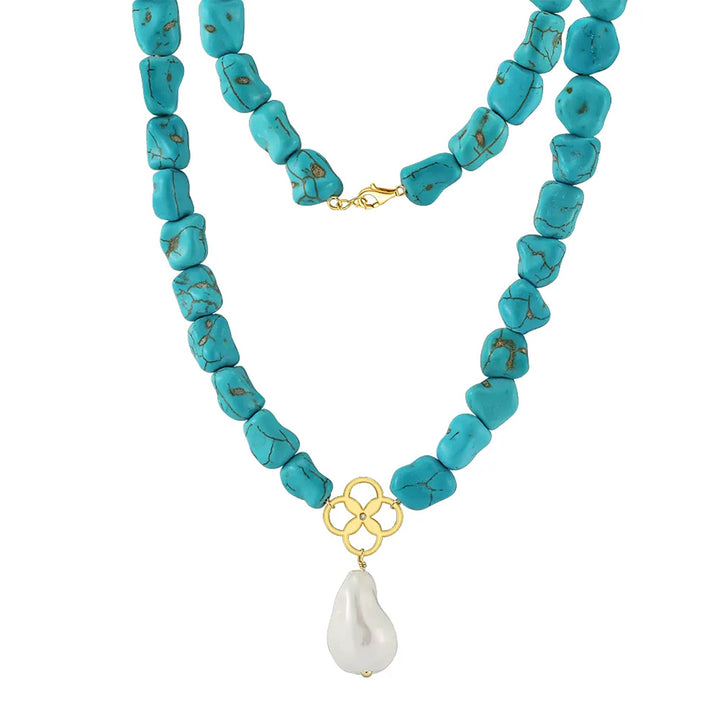 This Olyssa Turquoise & Pearl Droplet Necklace by Shaded the Label is a tale told in natural stones, where ocean whispers meet a nomadic soul. Hand-strung with soul-soaked turquoise stones and a unique baroque pearl, this necklace is for those who wander not to escape, but to become. It is a symbol of freedom, individuality, and a connection to the raw beauty of the earth. This limited-edition piece is a testament to handcrafted artistry and personal journeys.