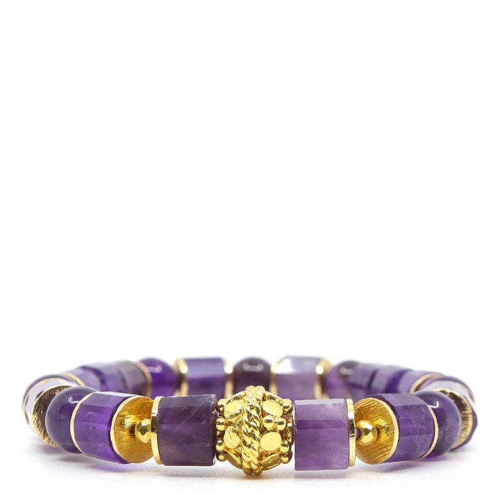 This one-of-a-kind bracelet features 8mm amethyst gemstones, 18K gold-filled Bali-inspired focal beads, and faceted polished hematites.
