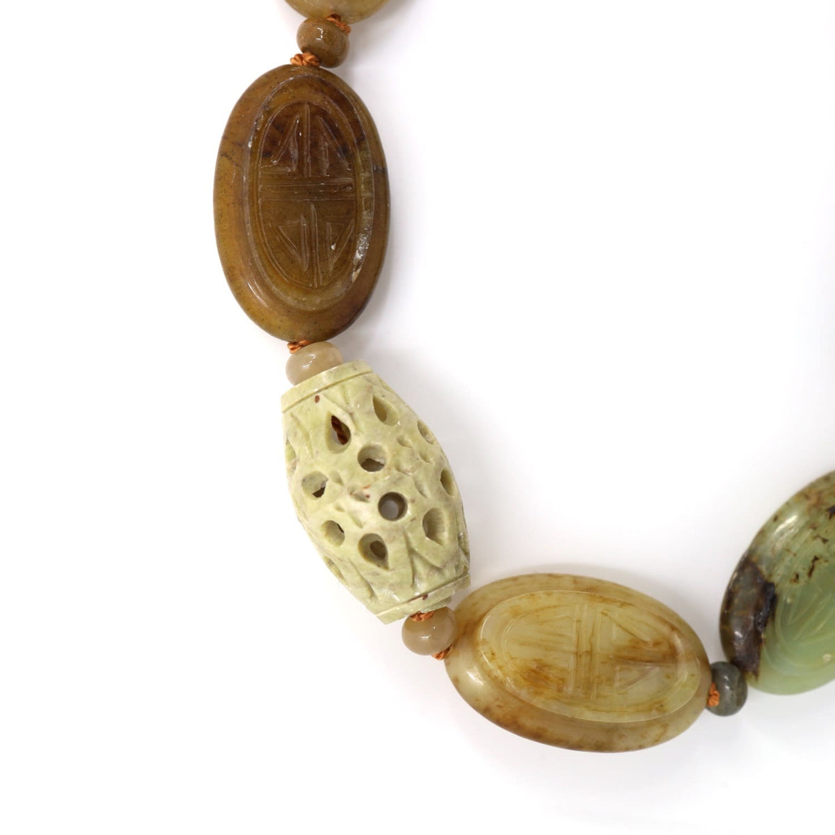 This necklace is made with hand-carved serpentine beads, carnelian silk thread, and sterling silver balls, rondelles, and a clasp. It is one-of-a-kind and made in Canada.
