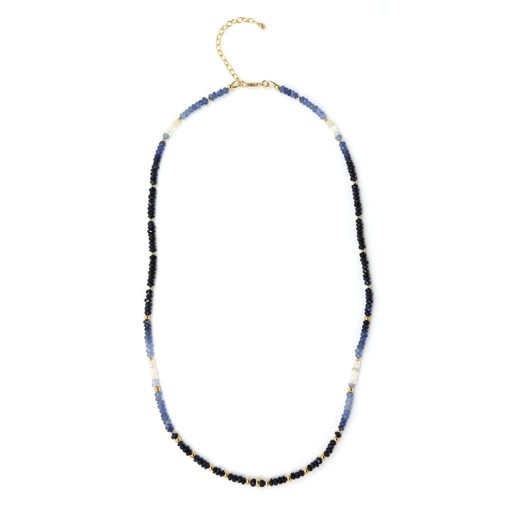 This Dainty Blue Sapphire Ombre Beaded Necklace by Shar Oke is a visual symphony of color. The design features a stunning gradient of natural sapphires, transitioning from deep navy to soft, shimmering white. The handpicked sapphires are accented with 14k gold-filled details, creating a beautiful and elegant piece. The unique, one-of-a-kind nature of the stones adds to the character and beauty of this necklace, making it a truly special accessory.