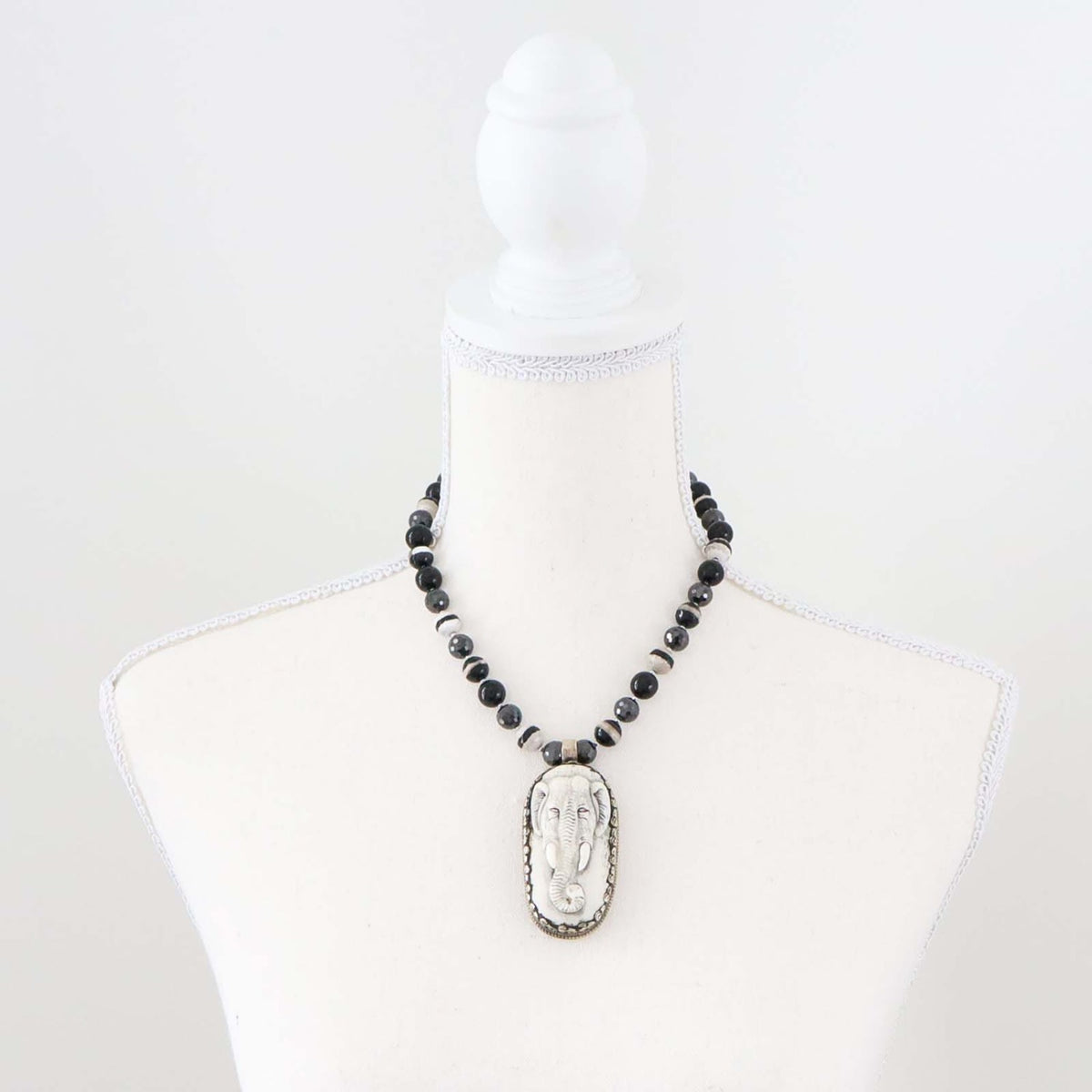 This necklace is handmade in Canada and features a hand-carved bone elephant pendant. It is adorned with black onyx, natural Tibetan striped agates, black cubic zirconia, and polished hematites, finished with a sterling silver spring clasp.