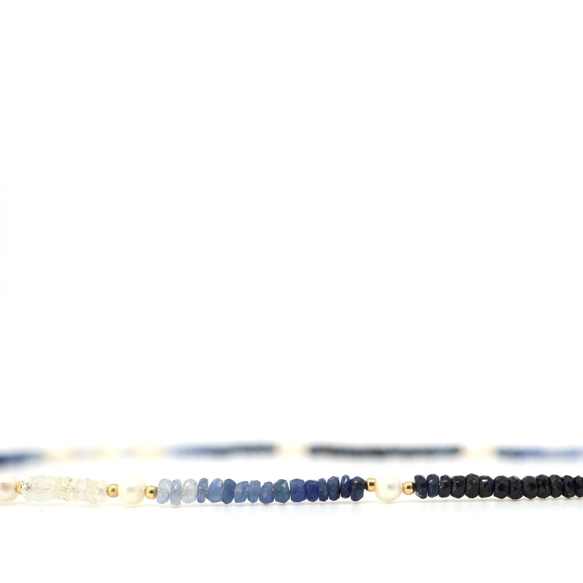 This necklace is a one-of-a-kind piece made in Canada. It is strung on satin gold wire and features 14k gold-filled balls, a clasp, and an extender. It is made with blue sapphire and freshwater pearl gemstones.