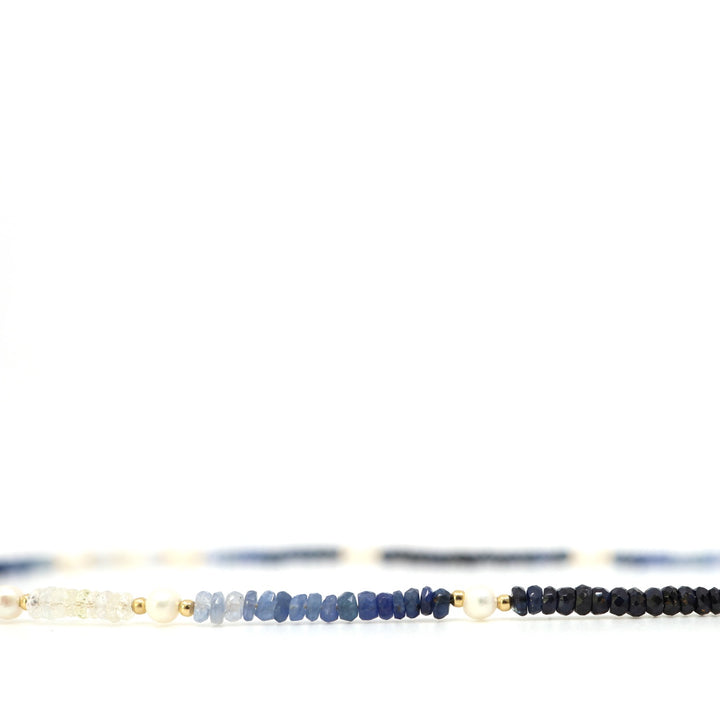 This Blue Sapphire & Freshwater Pearl Necklace by Shar Oke beautifully transitions from deep, rich blues to soft, shimmering whites. Each stone is carefully chosen to create a mesmerizing flow of color, while subtle 14k gold-filled accents add a touch of warmth. This necklace is a timeless piece that blends sophisticated elegance with a natural, effortless charm. Each stone is unique, adding to the character and beauty of this one-of-a-kind piece.