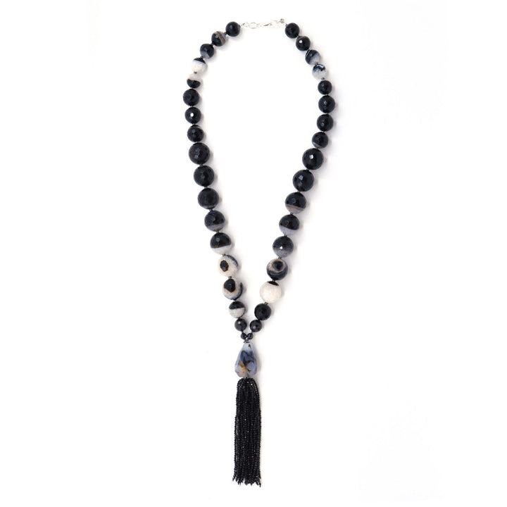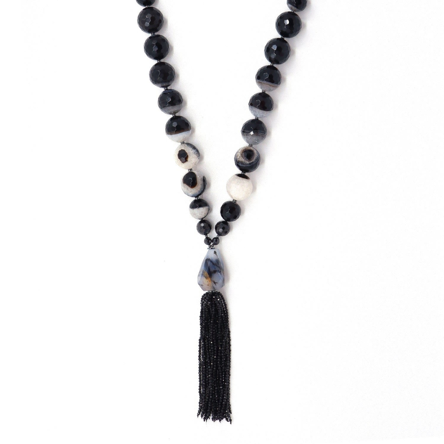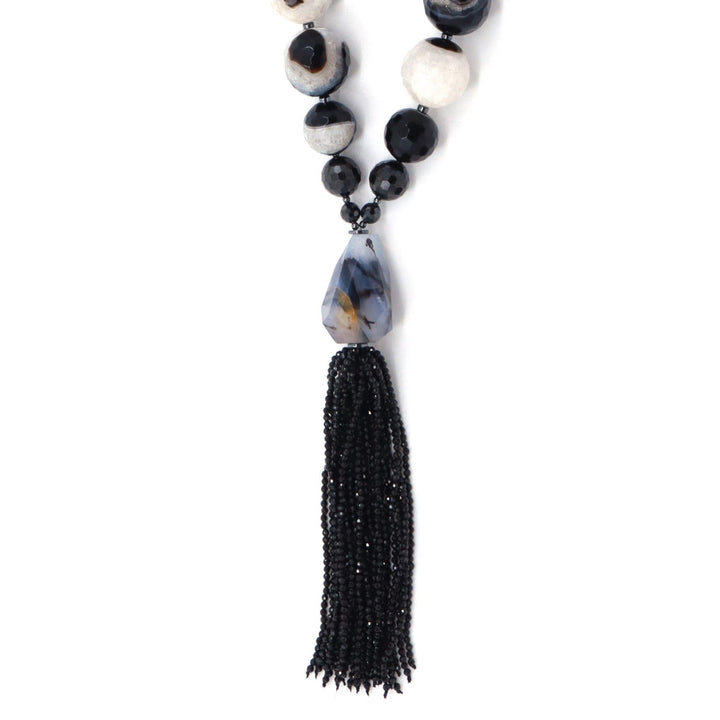 Clear Quartz & Black Agate, Black Cubic Zirconia & Black Spinel Tassel Beaded Necklace