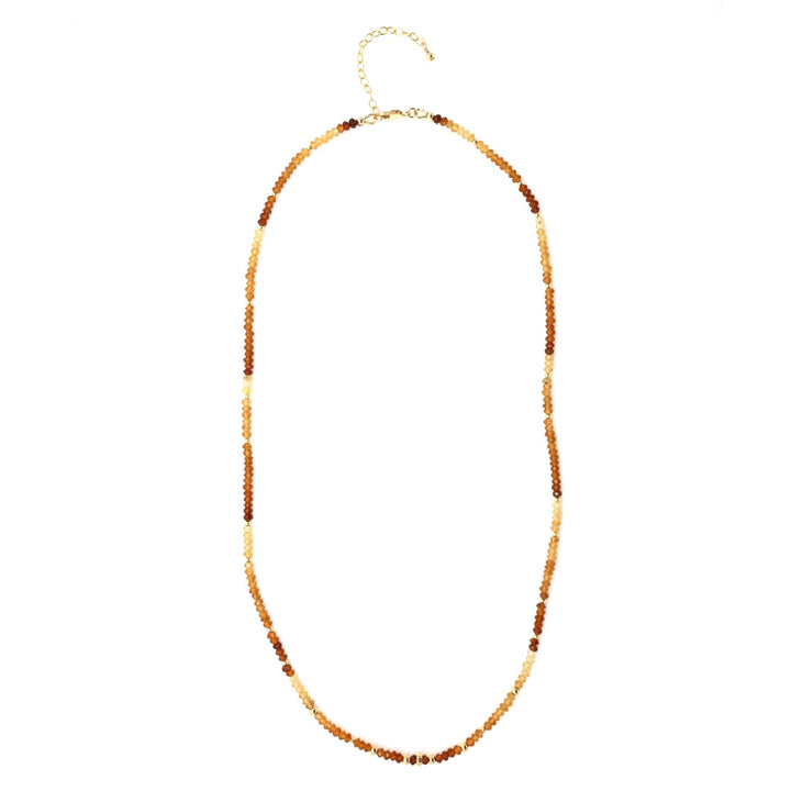 The Dainty Ombre Hessonite Beaded Necklace by Shar Oke is a vibrant and radiant piece. This beauty features a warm, gradient blend from rich cinnamon to golden honey, with each faceted hessonite handpicked from India for its fiery sparkle. Paired with stylish 14k gold-filled accents, it’s a one-of-a-kind piece perfect for adding a pop of color and a touch of warmth to any outfit.