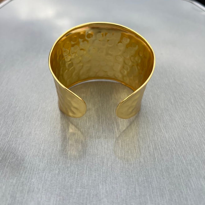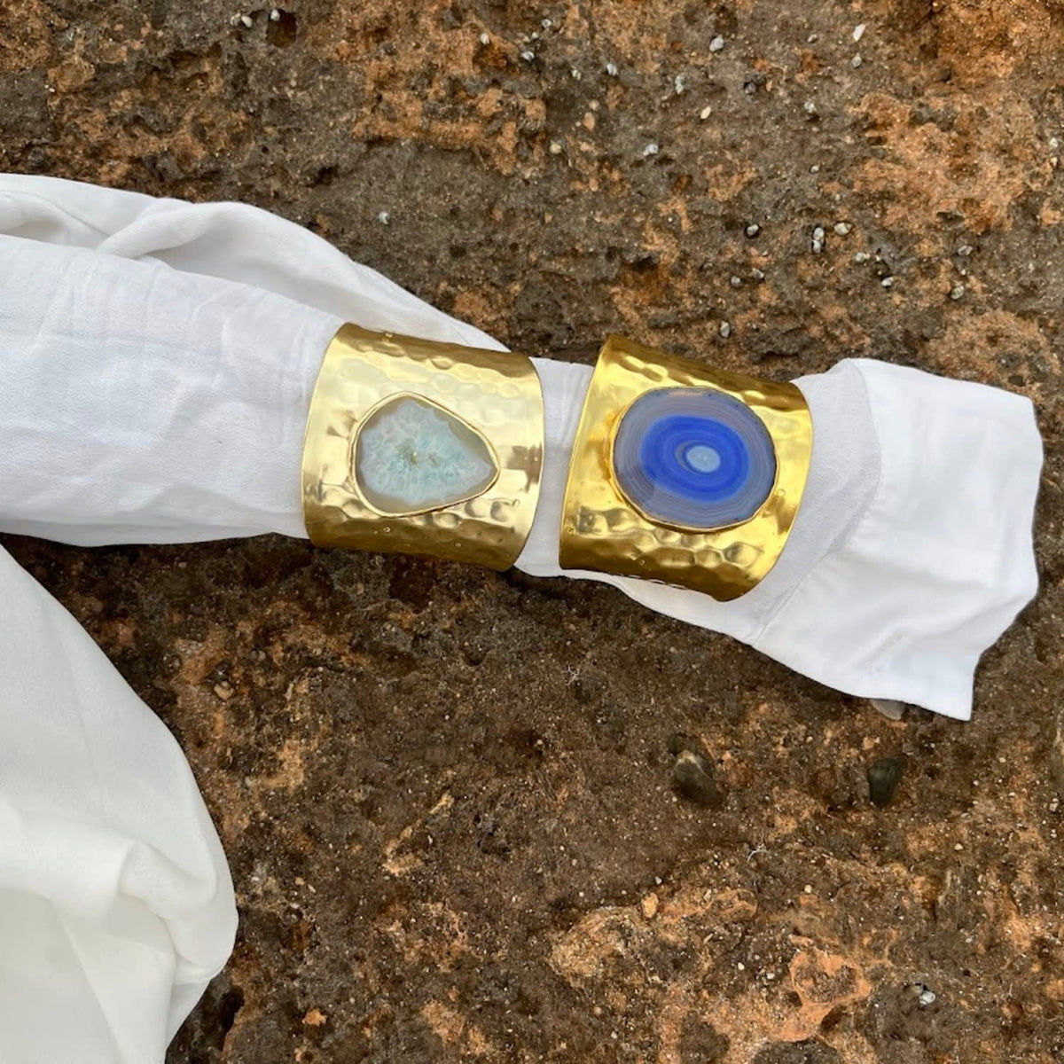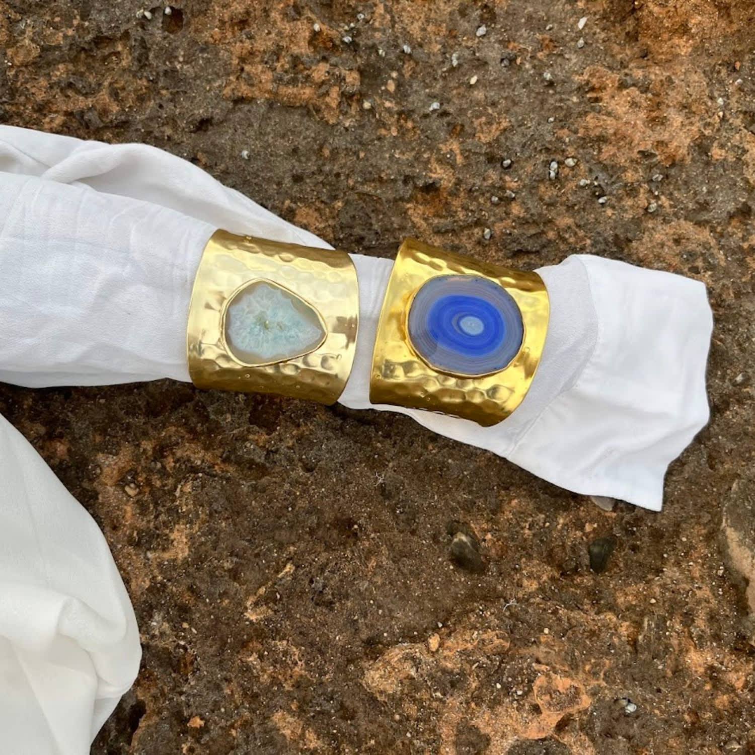 This one-of-a-kind cuff bracelet is handcrafted from high-quality materials and features a natural blue Agate stone. The specific metals are not specified, but the piece is described as a blend of sustainable luxury and craftsmanship.