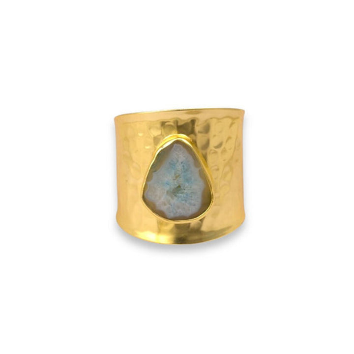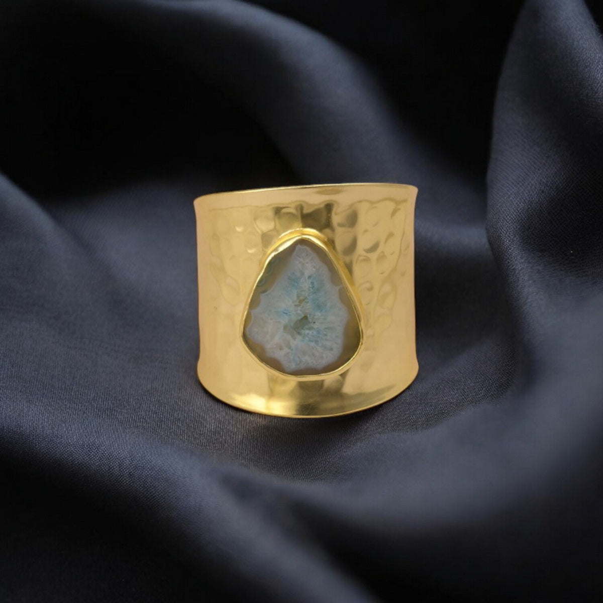 This Drusy Agate Bangle by Sibylla Delphica is a One of a Kind cuff bracelet that makes a luxurious and sustainable statement. Meticulously handcrafted, it features a natural blue Agate stone with a beautiful druzy texture that catches the light and adds a unique sparkle. This cuff is perfect for elevating your style with its elegant craftsmanship and natural, glamorous aesthetic.