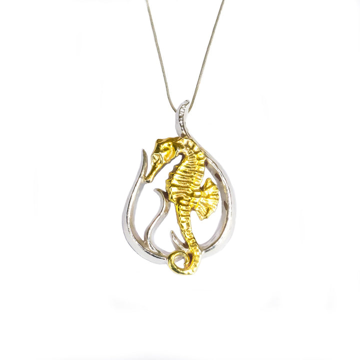 The Seahorse Pendant Eighteen Carat Gold On Solid Sterling Silver by Simon Kemp Jewellers is a beautiful piece that appeals to all lovers of aquatic designs. The seahorse is highly detailed, with clearly defined scales and fins. The pendant is cast in solid sterling silver with an 18ct gold layer, creating a stunning contrast with the silver reeds.