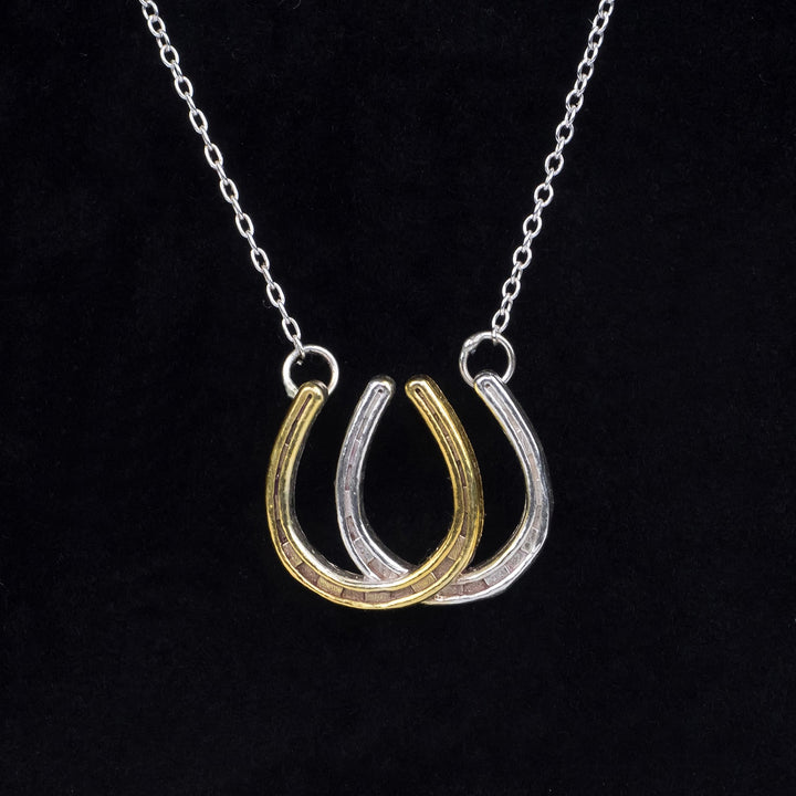 This pendant is cast in solid sterling silver. It features one horseshoe with a rich layer of 18-karat gold on silver and the other in silver. The total length of the design is 18 inches.