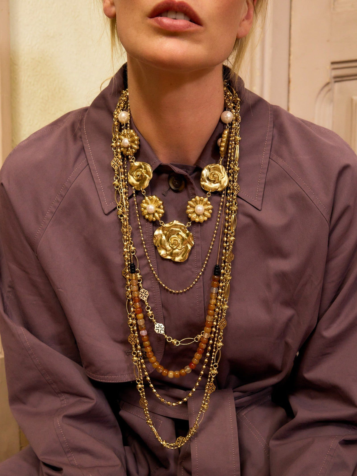 This short necklace is made with two types of brass flowers with protection, natural stone beads, and two oval crystal pieces. The length is 45cm with a 6cm extension. The weight is 120g.