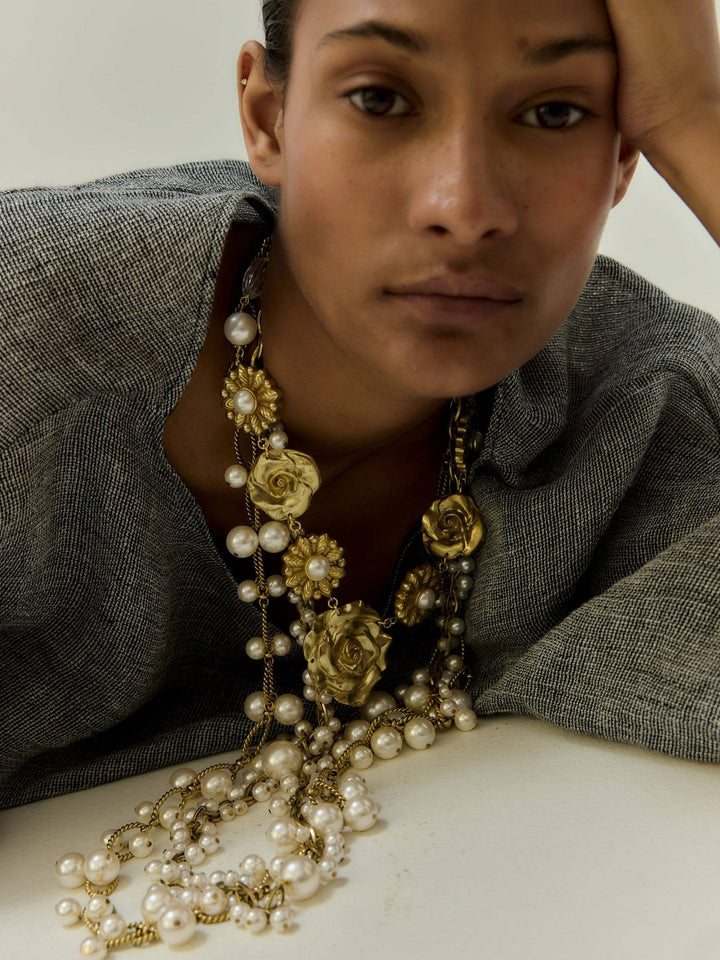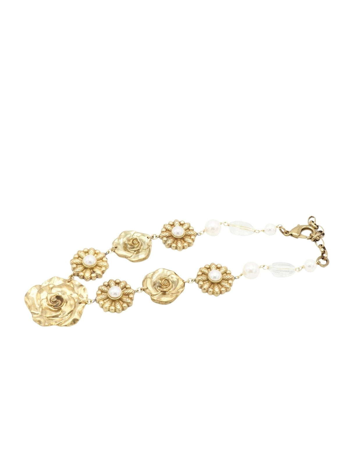 This Dues Flors Necklace - White by Sita Nevado is a unique and artistic accessory. The short necklace is made with two types of brass flowers with protection, natural stone beads, and two oval crystal pieces at the ends. The intricate design and the combination of different materials create a beautiful and one-of-a-kind piece that is perfect for adding a touch of elegance to any look.