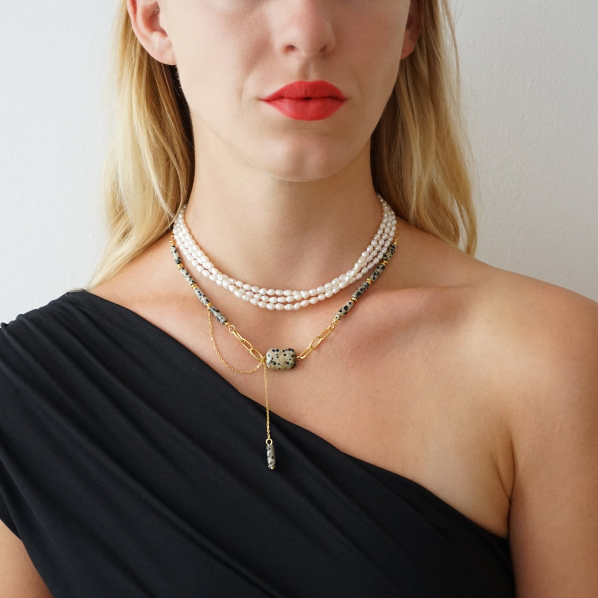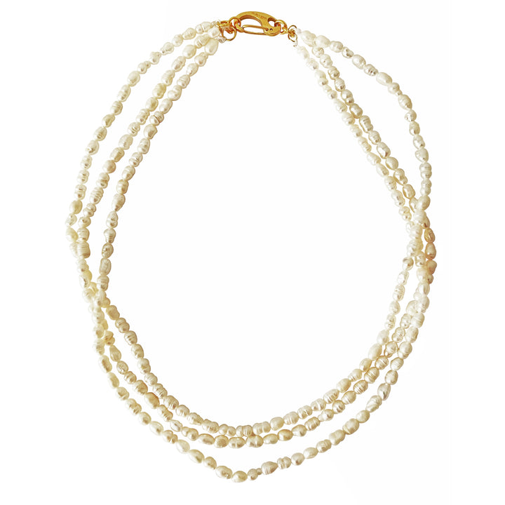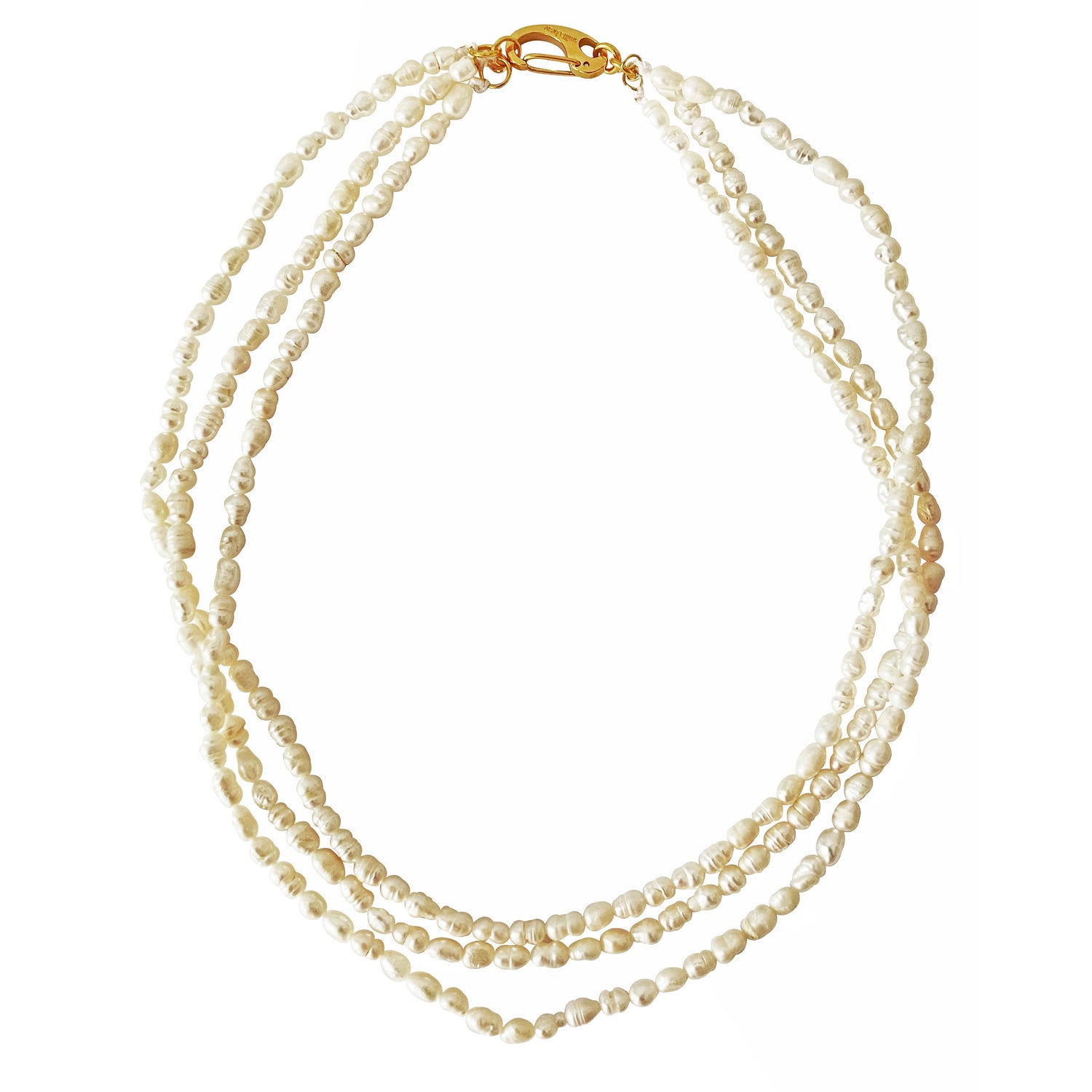 This pearl necklace is handmade in Germany with 3-4mm rice-shaped freshwater pearls and gold-plated stainless steel.