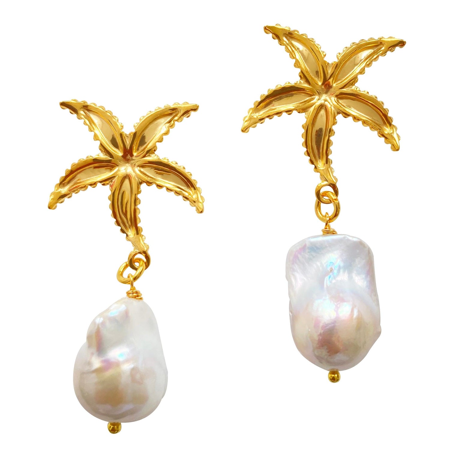 These pearl earrings are made from durable stainless steel and are adorned with a soft-glowing baroque pearl. The design features a delicate starfish.