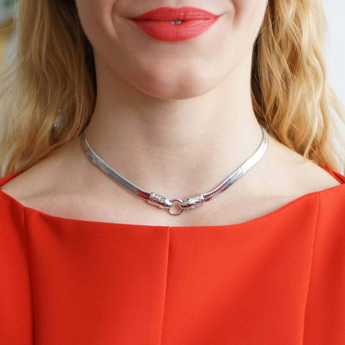 The Silver Snake Necklace Serpentina by Smilla Brav is a bold and edgy choker. Crafted from high-quality stainless steel, this tarnish-resistant and hypoallergenic necklace wraps gracefully around the neck. It features two intricately detailed snake heads that symbolize power and transformation. Whether worn alone or layered, this choker is a must-have for those who love bold, serpent-inspired fashion.