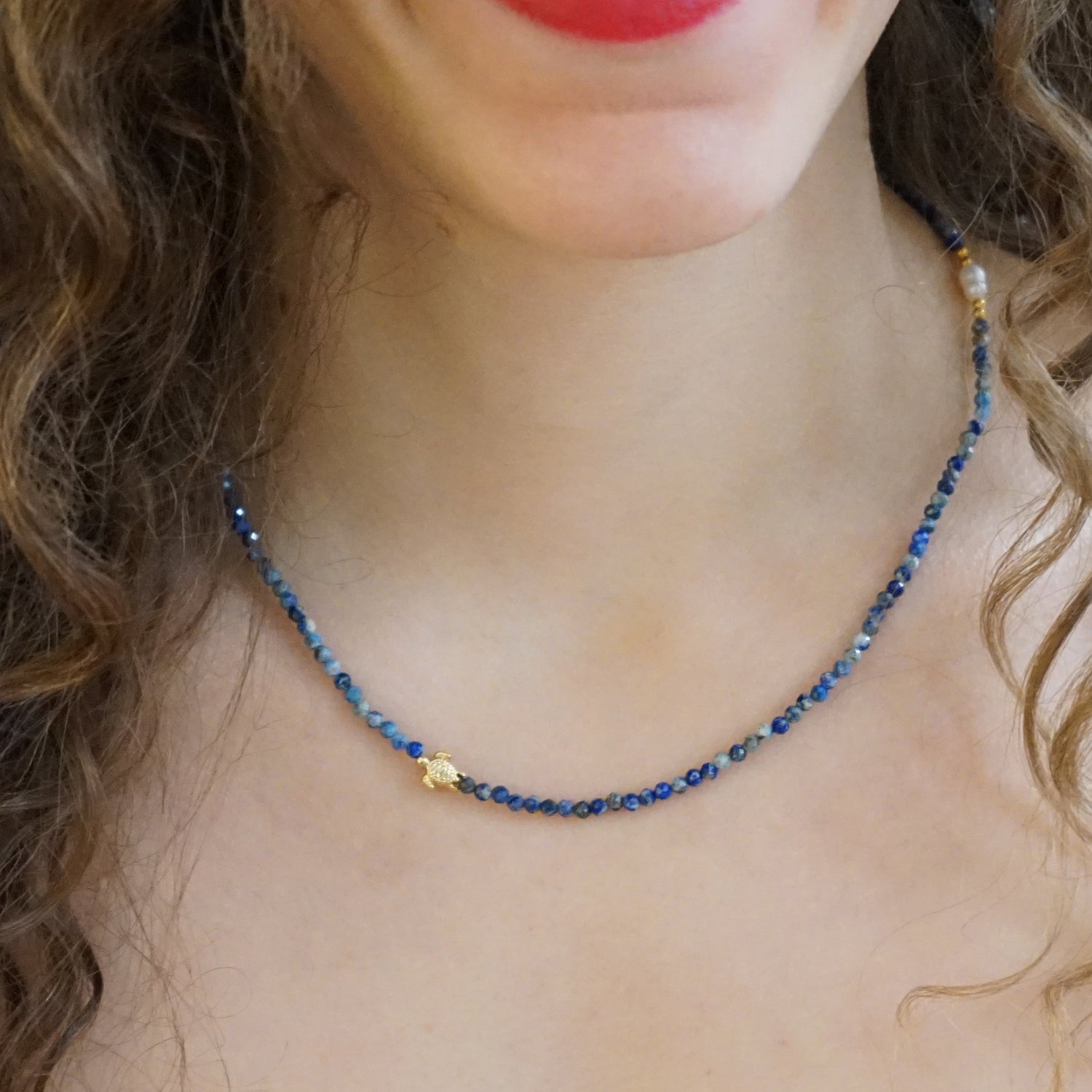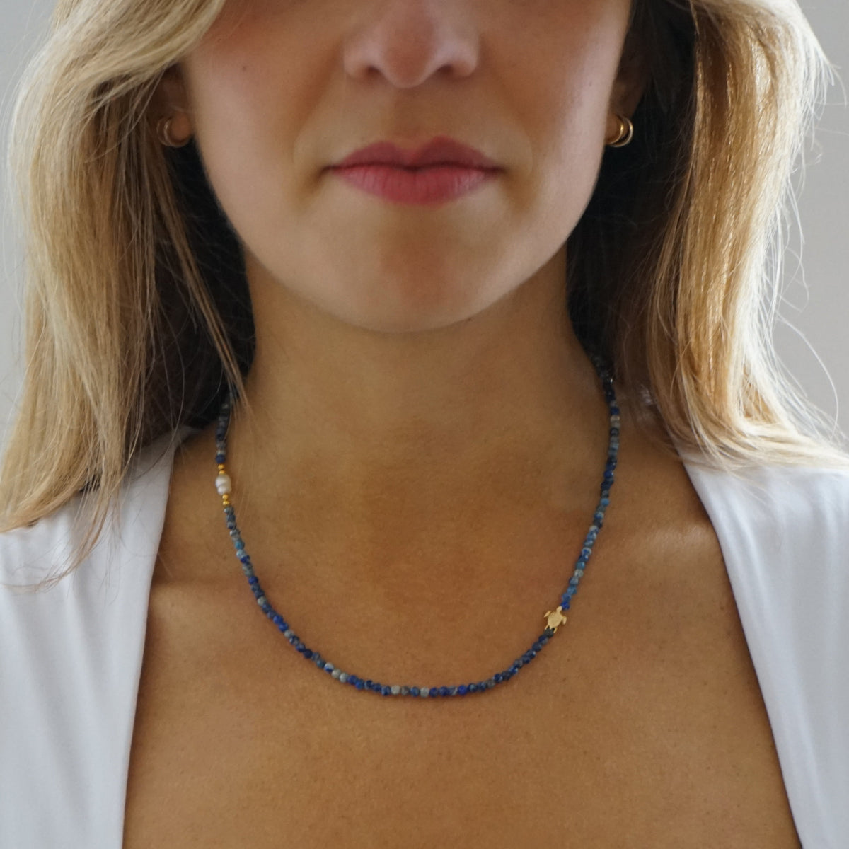 This Turtle Necklace Ada by Smilla Brav is a funky and colorful piece infused with the essence of the ocean. The playful design, featuring faceted lapis lazuli gemstones and a delicate freshwater pearl, is meant to inject sunshine into your life and ensure your style is never boring. Meticulously handcrafted in Germany, this necklace is a unique masterpiece that symbolizes the calm and enduring spirit of the sea. It's a beautiful accessory for anyone who wants to add coastal elegance to their look.