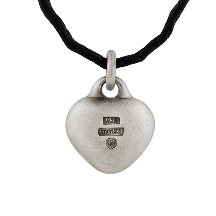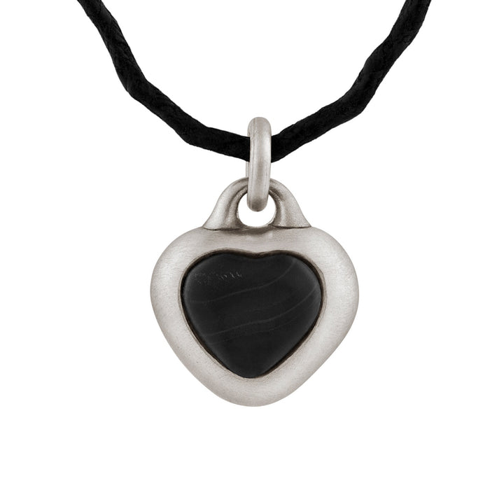 This pendant is handcrafted from solid 925 sterling silver with an oxidized matte finish. It features a black agate stone heart and comes with a waxed cotton cord.