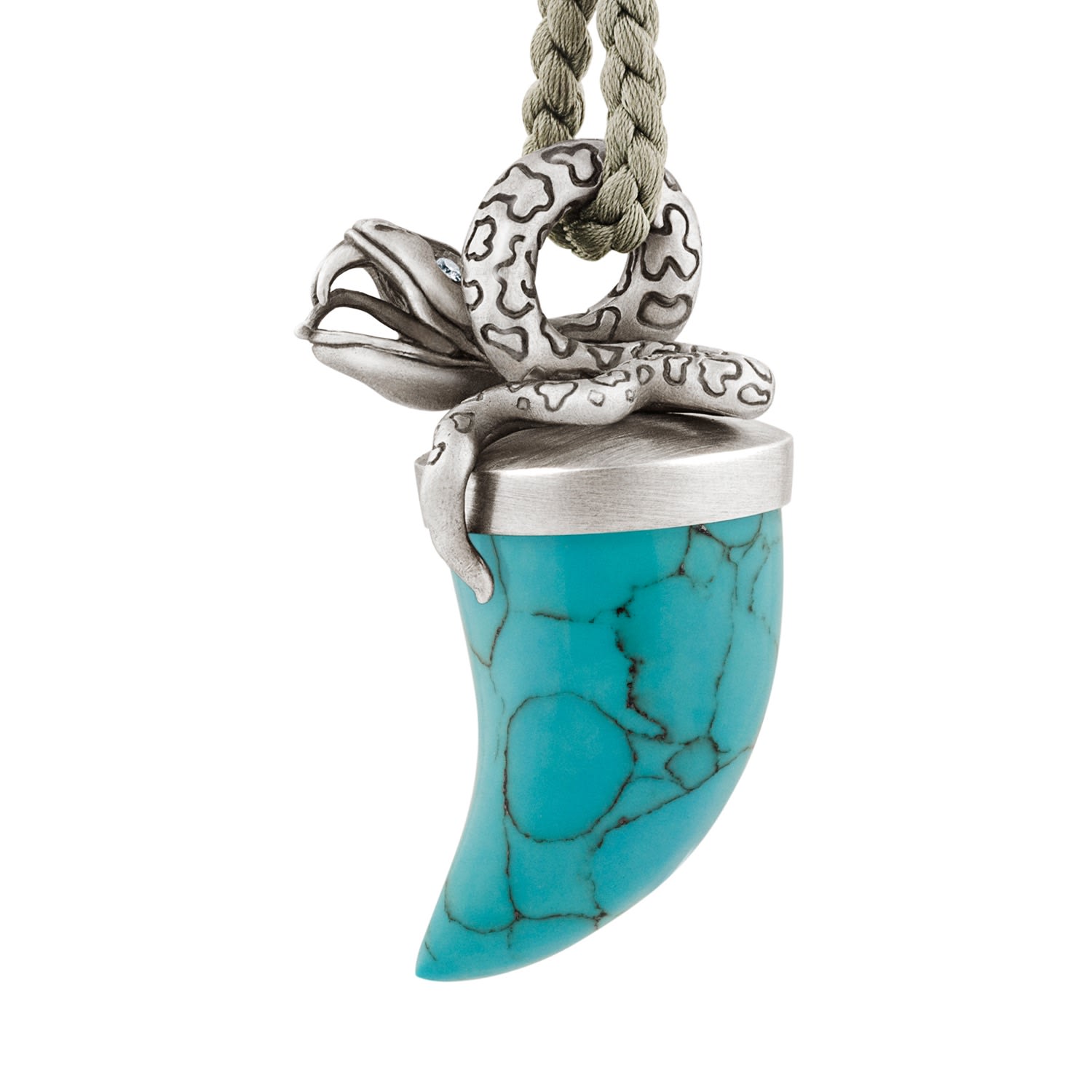 This handcrafted necklace features a solid .925 sterling silver snake pendant with diamond eyes (0.06 ct total weight, FG color, SI2 clarity). It includes a hand-carved turquoise tusk and an adjustable silk cord with a .925 sterling silver clasp. The dimensions are 1.2" x 2" x 0.9". Made in the USA.