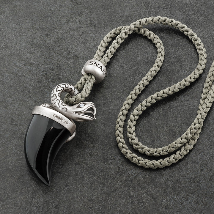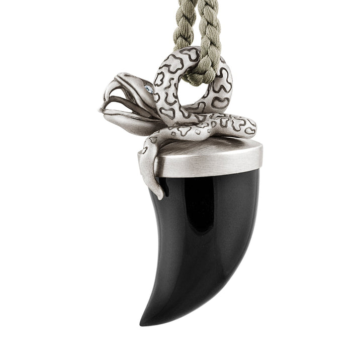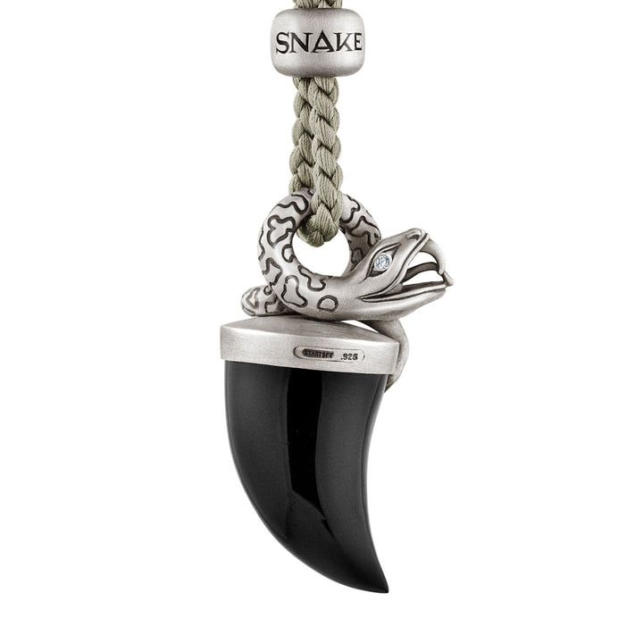 This pendant necklace is crafted from solid .925 sterling silver and features a hand-carved black onyx tusk. The snake's head is set with ideal cut FG color SI2 clarity diamonds (0.06 ct total weight). The necklace hangs from an adjustable silk cord and has a solid .925 sterling silver clasp.