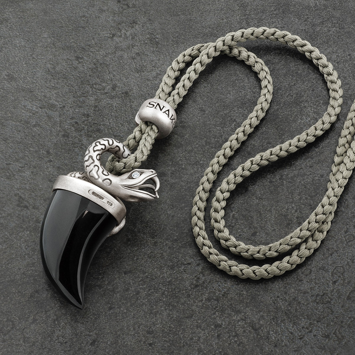 This Snake Pendant Necklace With Black Onyx Tusk by Snake Bones is a luxurious and striking accessory. The necklace features a hand-carved black onyx tusk with a sterling silver snake, which is set with ideal cut diamonds for eyes. The adjustable silk cord adds a touch of unique elegance. This necklace is a perfect statement piece for those with a bold and edgy style.