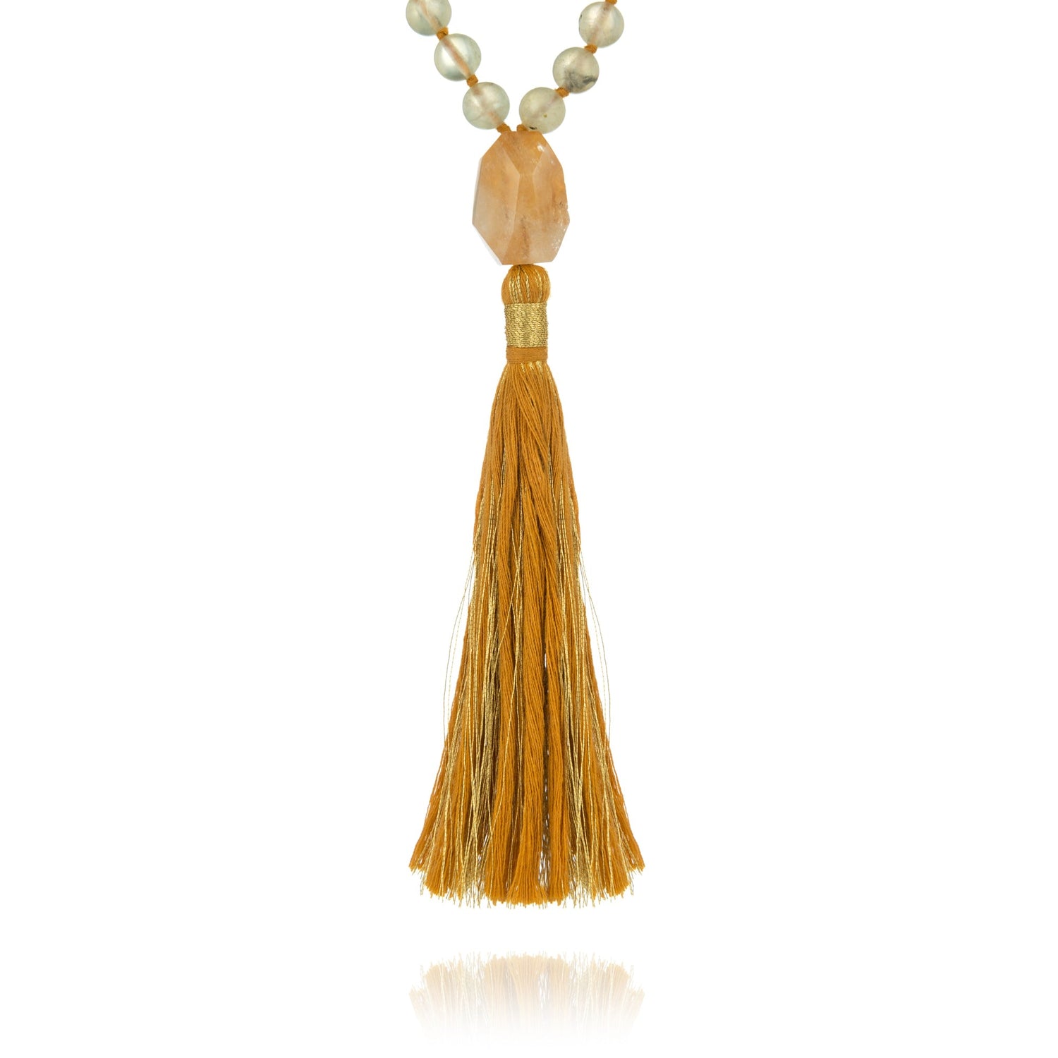 The Truth Mala by Sohavi is a beautifully hand-strung beaded necklace designed to promote authenticity and inner knowing. It features Prehnite gemstones, a stone of sincerity, and Citrine, a gemstone known to attract wealth and success. The necklace has a large faceted Citrine guru bead and a luxurious silky tassel with a metallic gold thread.