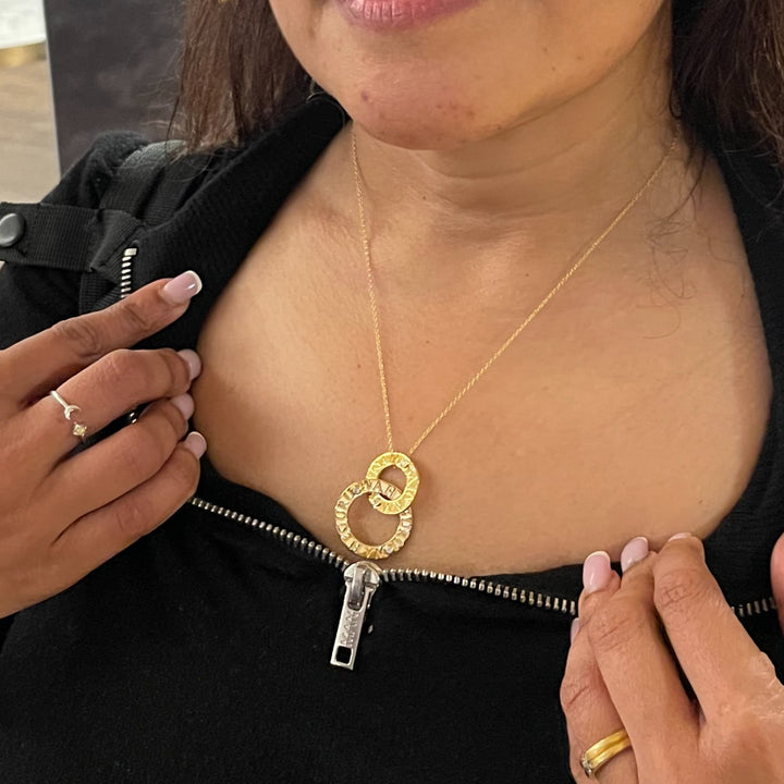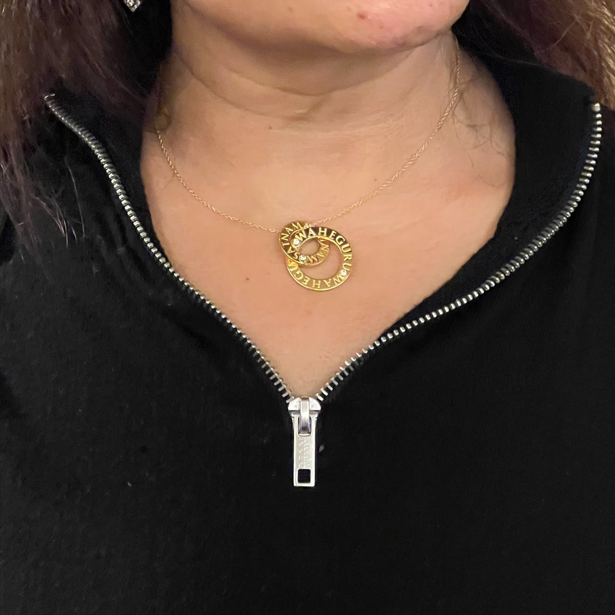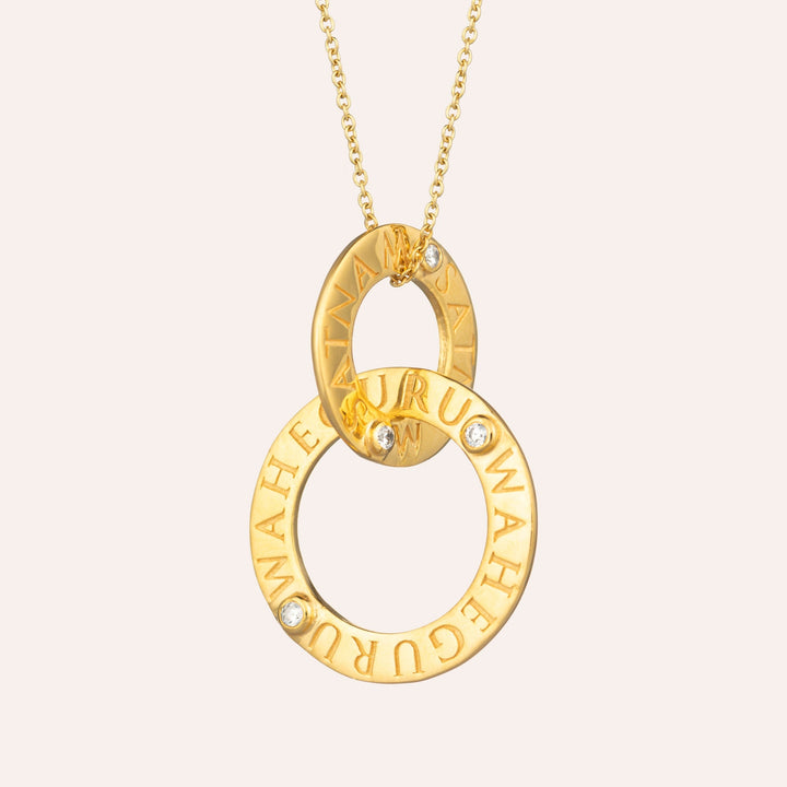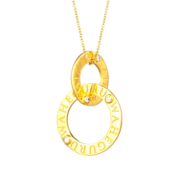 This Gold Infinity Necklace by Sohavi is a meaningful and elegant piece. It features two entwined rings, known as the Infinity pendant, crafted from sterling silver with a heavy 22K gold vermeil plating. The top ring is inscribed with the mantra "Satnam" and the bottom with "Waheguru," symbolizing eternal truth and the wondrous universe.