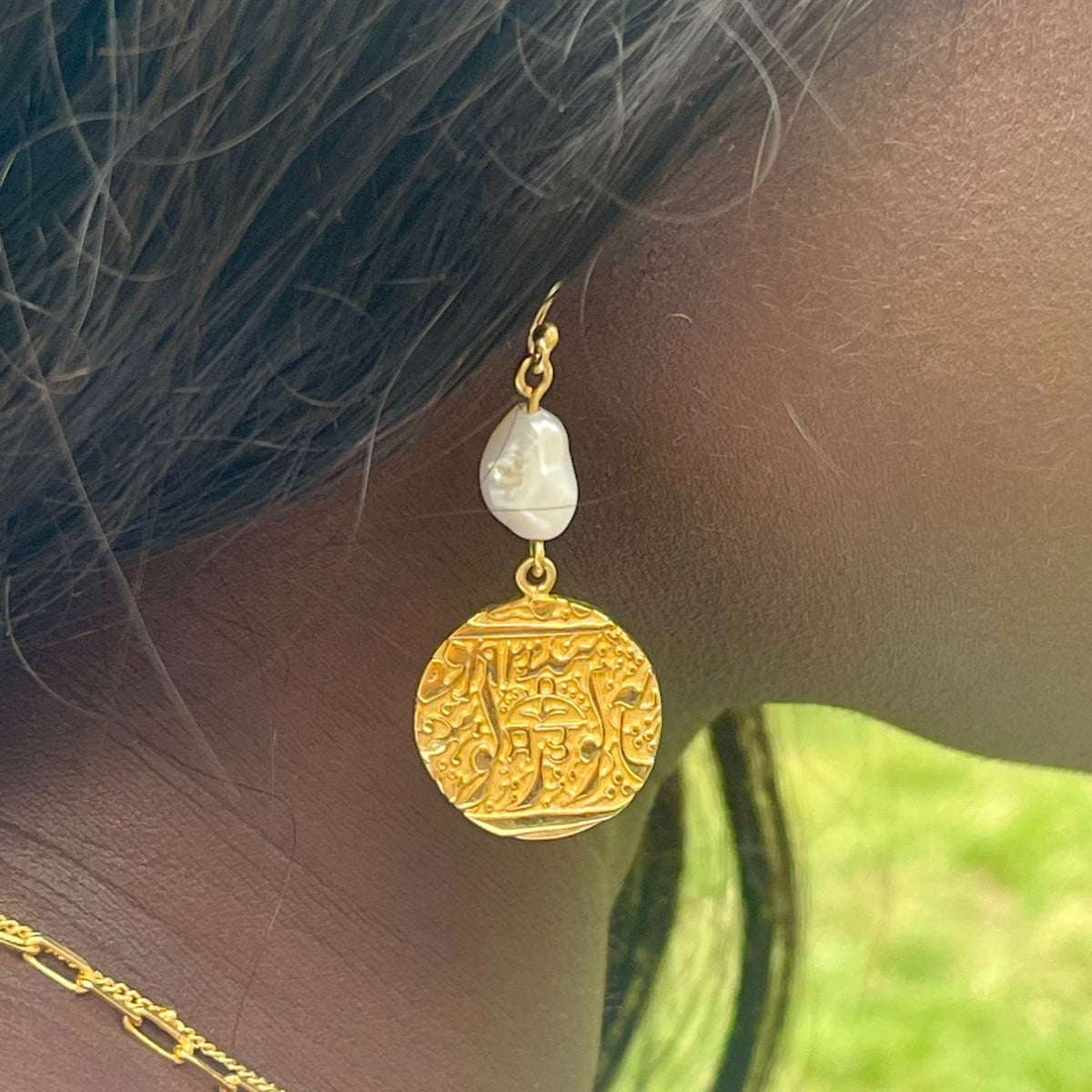 These Truth Coin Earrings With Baroque Pearls by Sohavi are a unique and meaningful accessory. Inspired by ancient coins of the Sikh Empire, they feature artistic symbols and the word "Sat," meaning truth, combined with a chhatra, a symbol of crowning glory. The beautiful baroque pearls add an organic touch, making these earrings a powerful statement of cultural heritage and elegance.