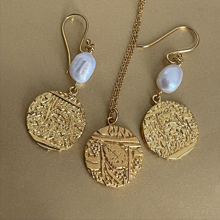Crafted from sterling silver 925 with a heavy 22ct yellow gold vermeil plating, these earrings feature an ancient coin design and a baroque pearl.