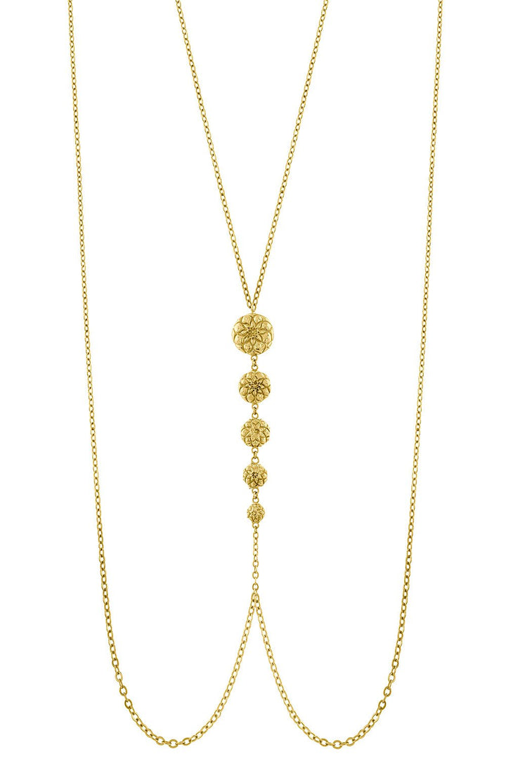 This Body Chain 5 Peyotes Nuivare by Sophie Simone Designs is an elegant and artistic accessory. Handmade in bronze with 22k gold plating, this body chain can be worn over or under any outfit. It's the ideal accessory to adorn your summer look, instantly making you feel like a goddess and symbolizing a bold, confident style.