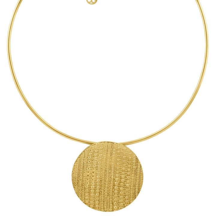 The Moon Choker by Sophie Simone Designs is a unique piece that honors Haramara, the sacred ocean. This handmade choker is made from 22-karat gold-plated bronze and is inspired by the mysteries and beauty of the ocean. It combines different elements and textures, such as coral and sea urchin, and features a beautiful moon symbol. The Moon Choker is a reflection of the ocean, asking us to pay attention to its beauty and to respect it.