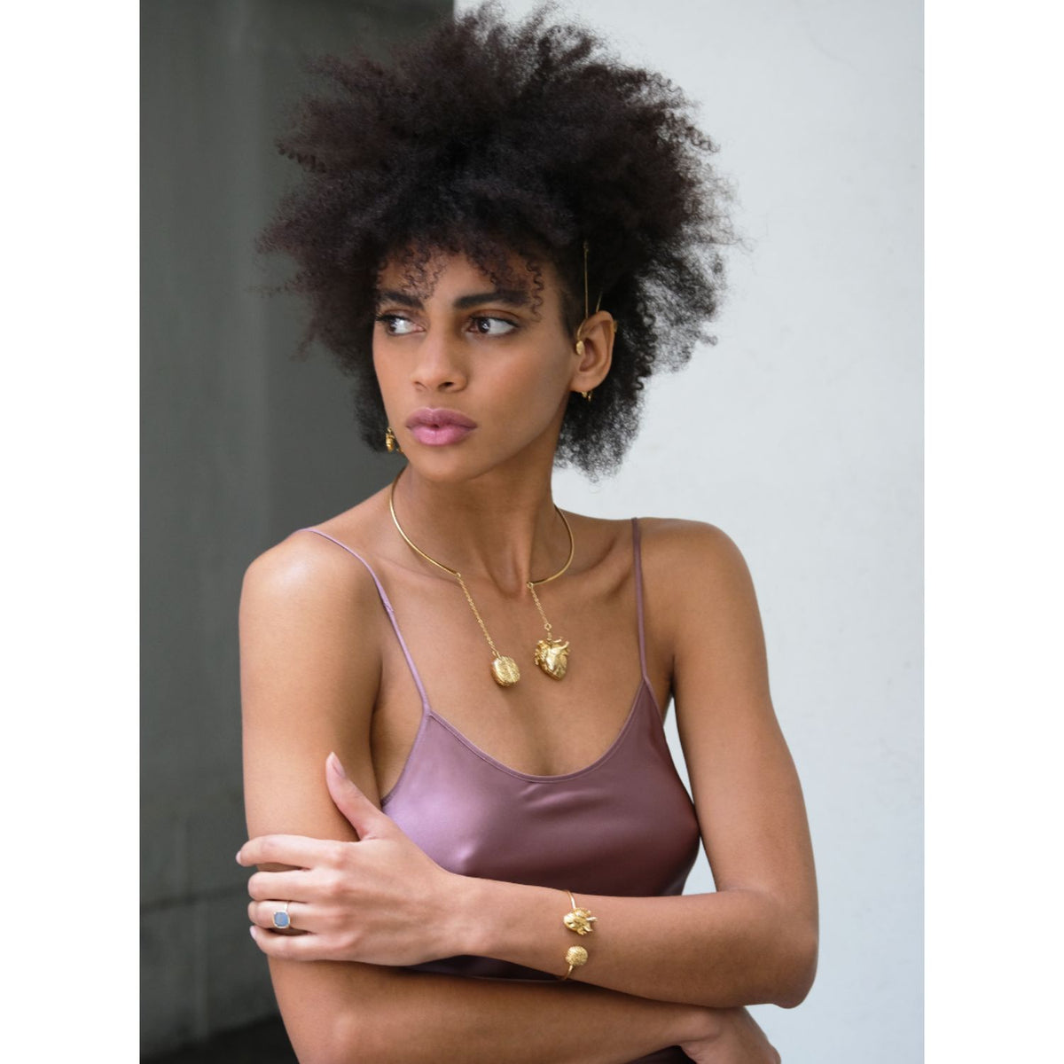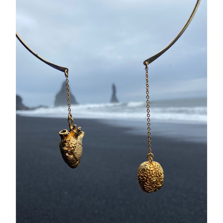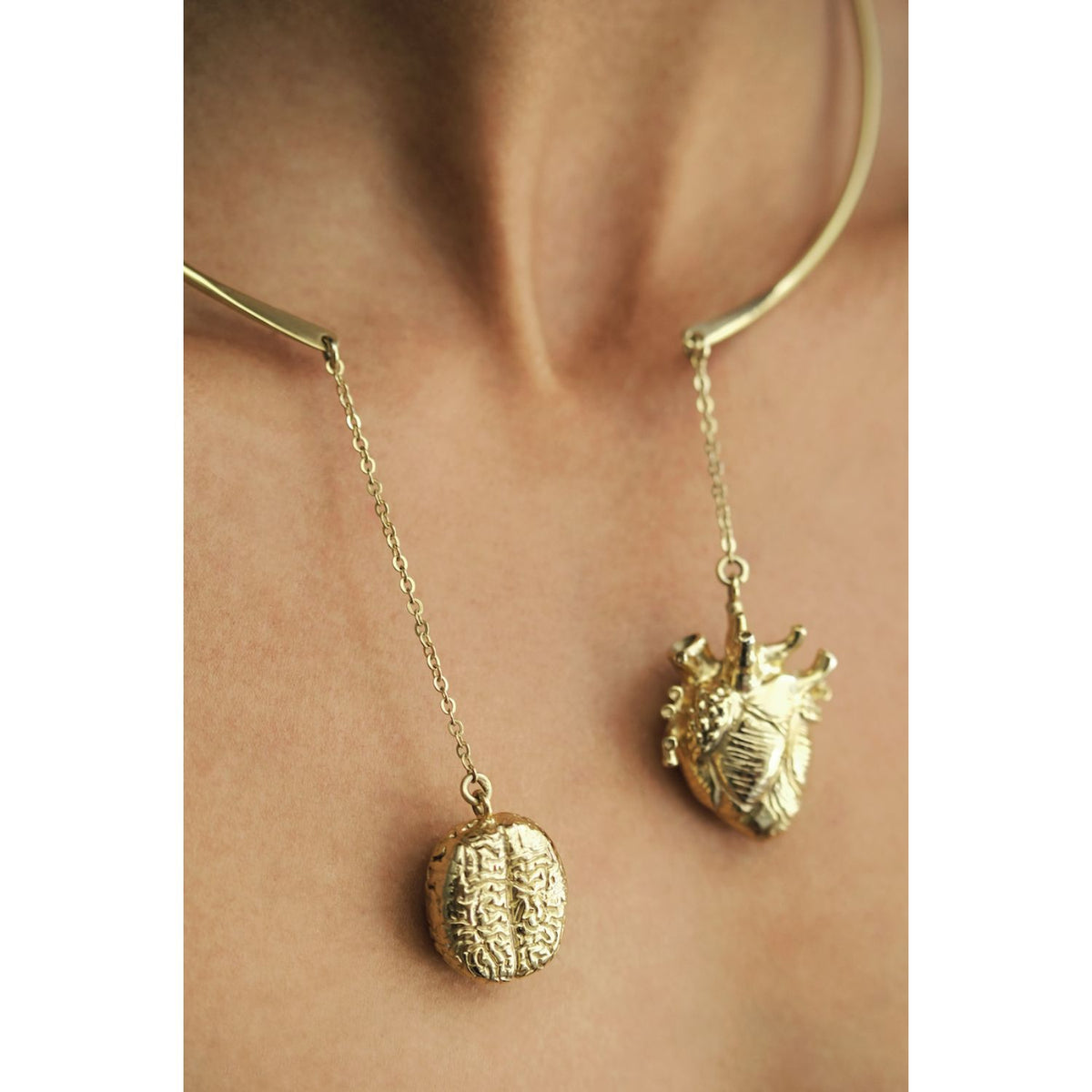 This Choker Heart And Brain by Sophie Simone Designs is a beautiful and philosophical piece that explores the eternal relationship between the heart and the brain. The handmade bronze locket represents the harmonious flow between logic and intuition, a special space where doubt disappears and answers are evident. This unique and meaningful piece is a perfect amulet to hide a special secret, such as a poem or a stone, making it a deeply personal treasure.