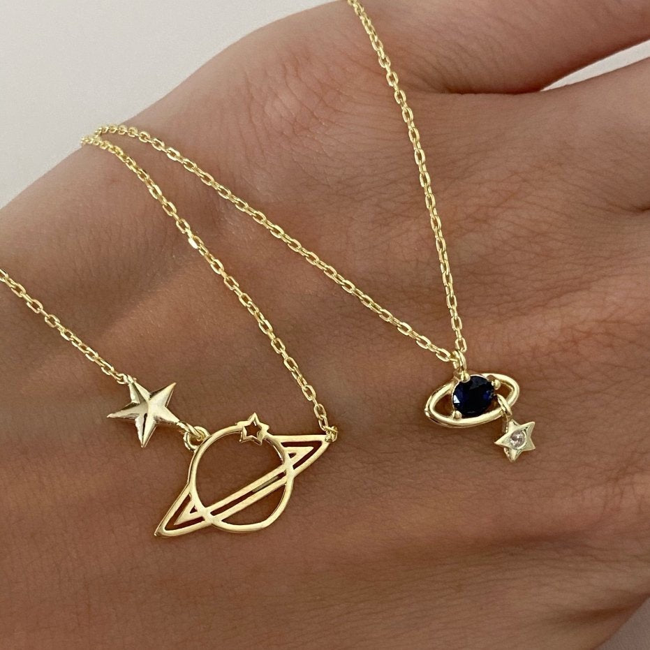 This Double Saturn Necklace Layering Set Sterling Silver by Spero London will give your look a celestial sparkle. This set of two shimmery Saturn necklaces is perfect for the modern-day space cadet.