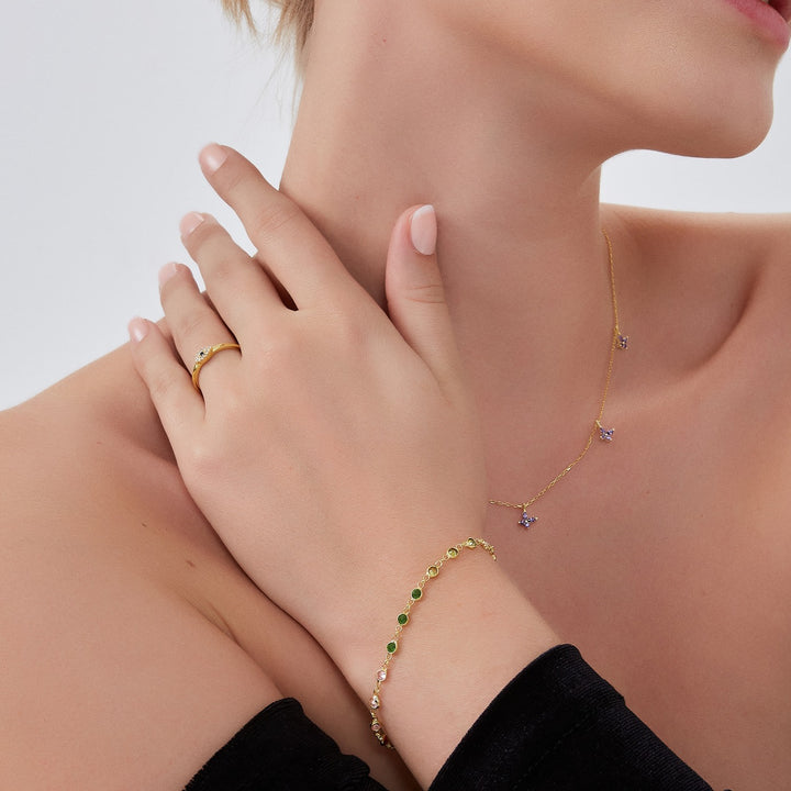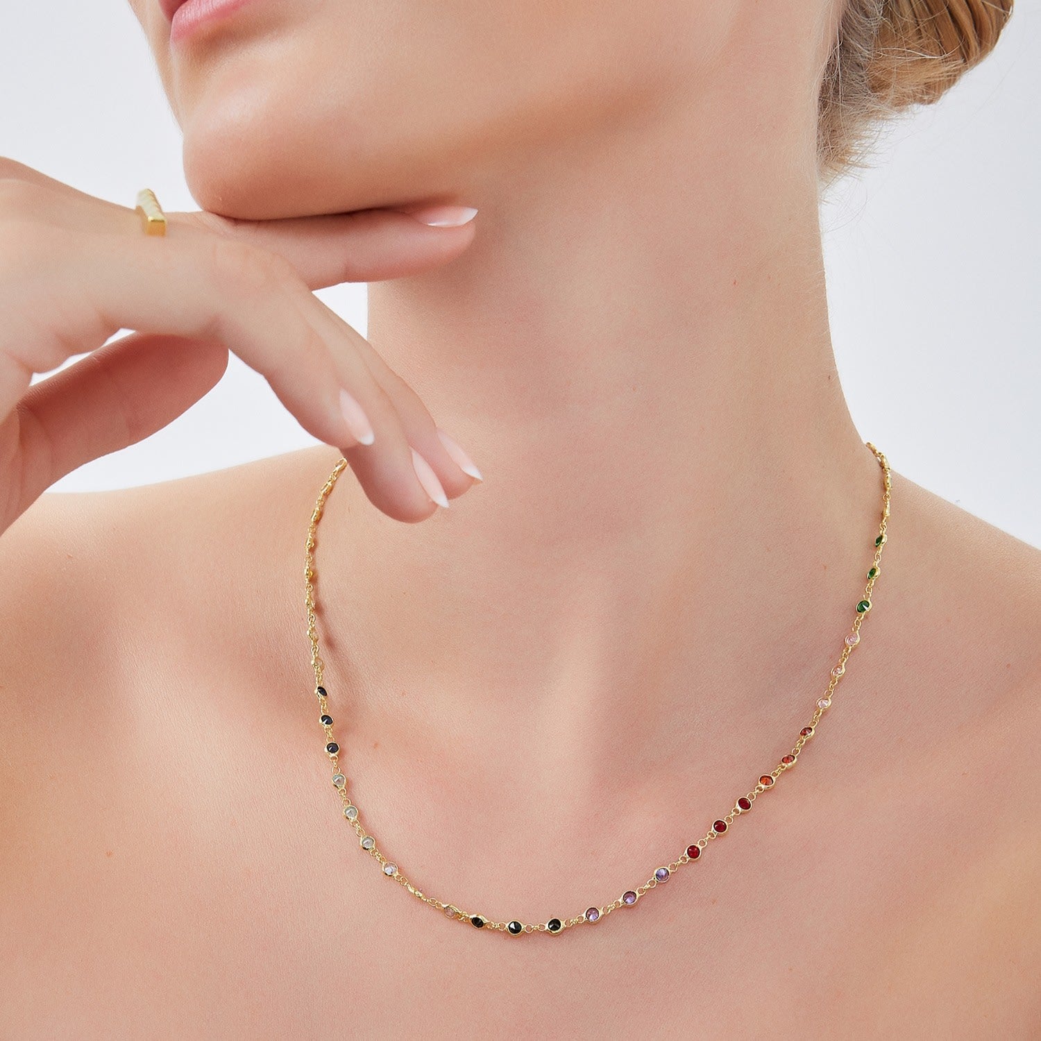 Colourful Rainbow Jewelled Tennis Style Sterling Silver Chain Necklace & Bracelet Set - Gold