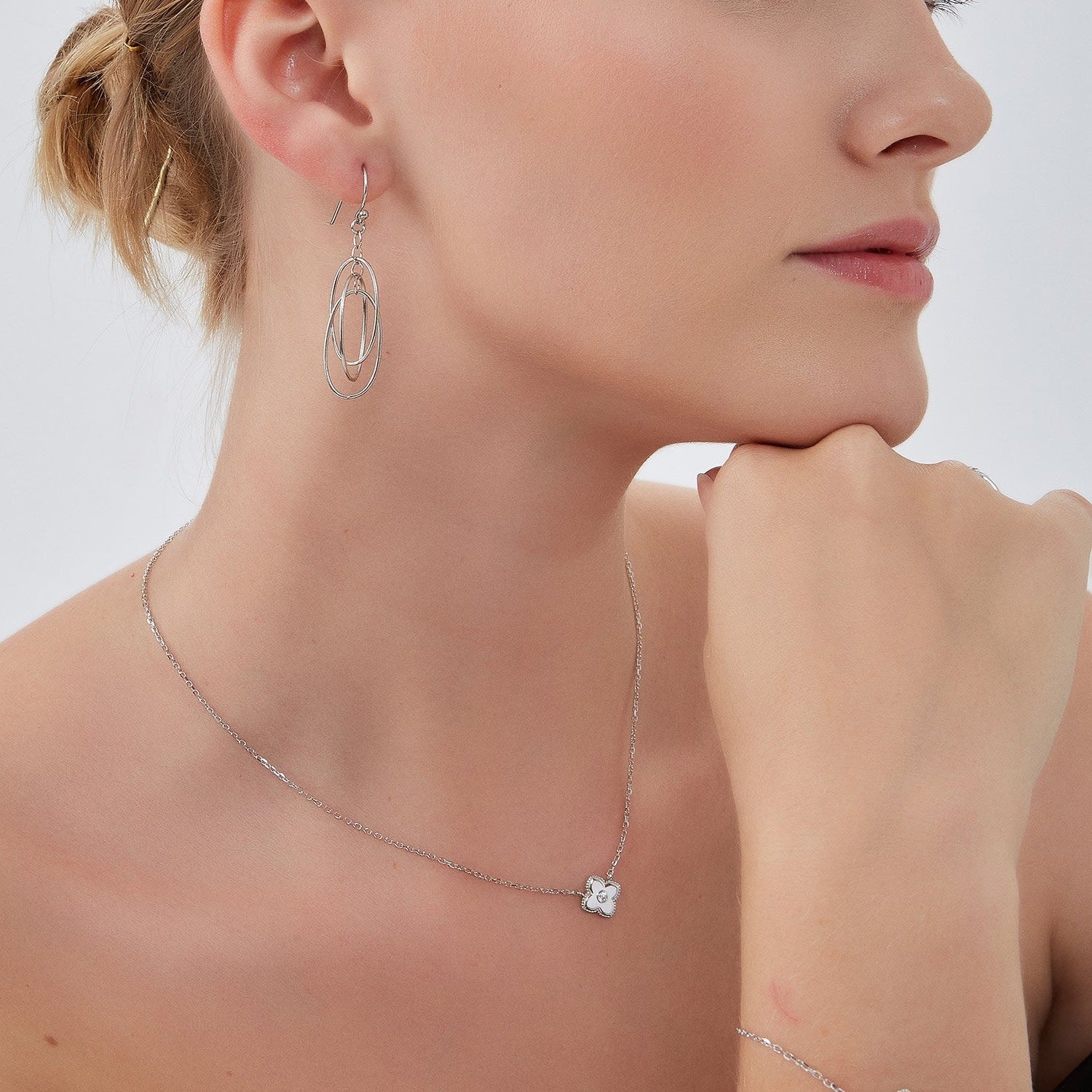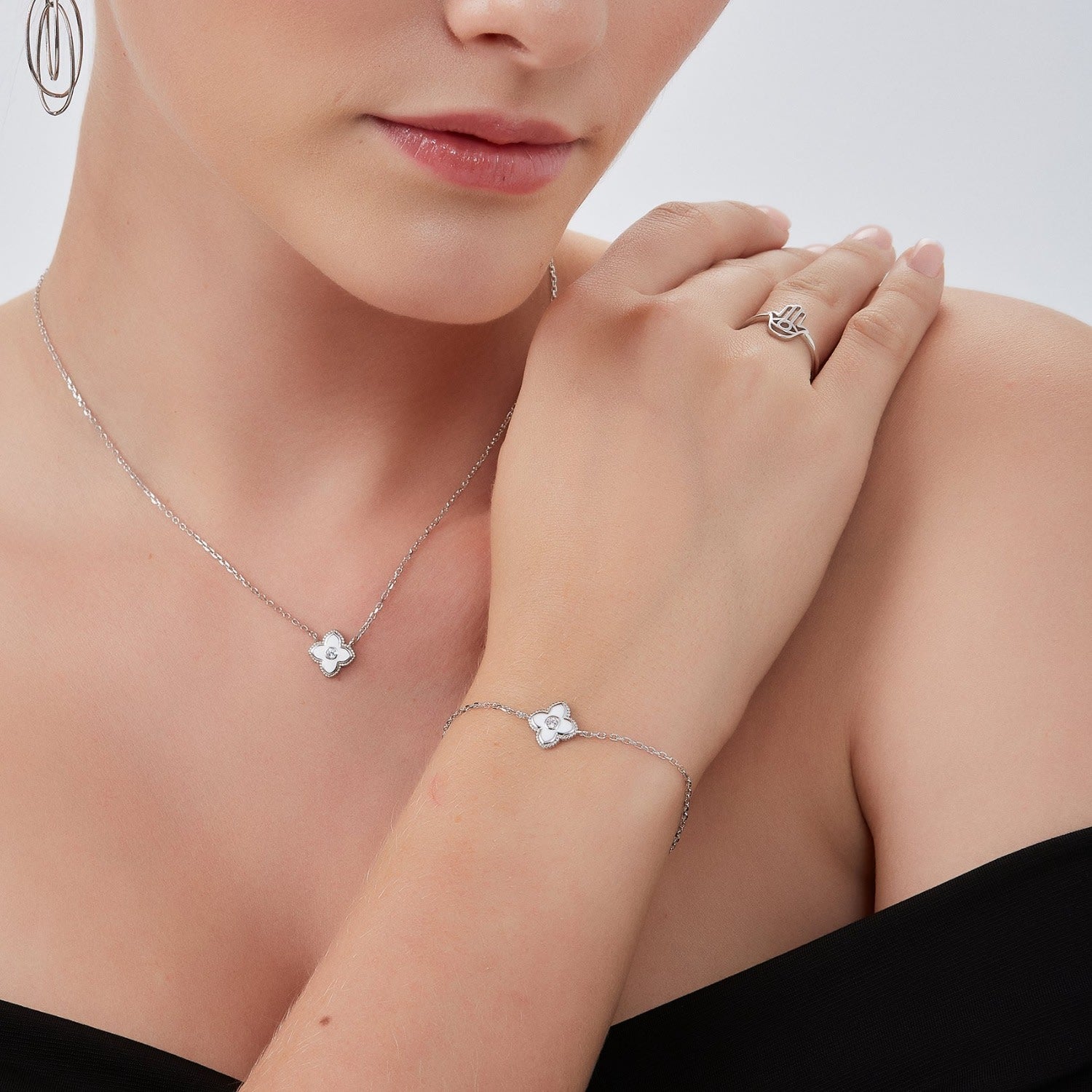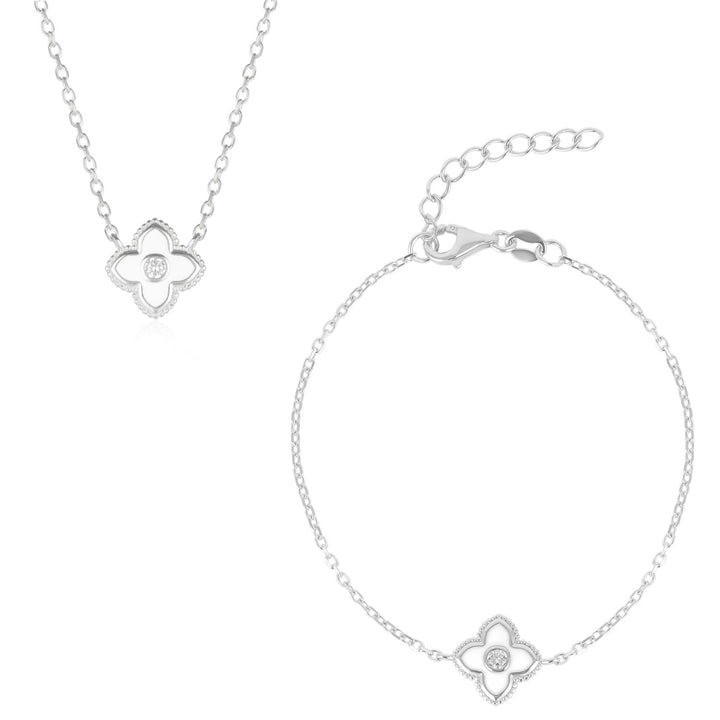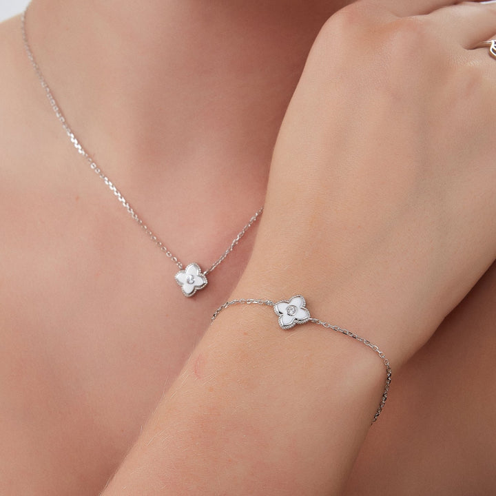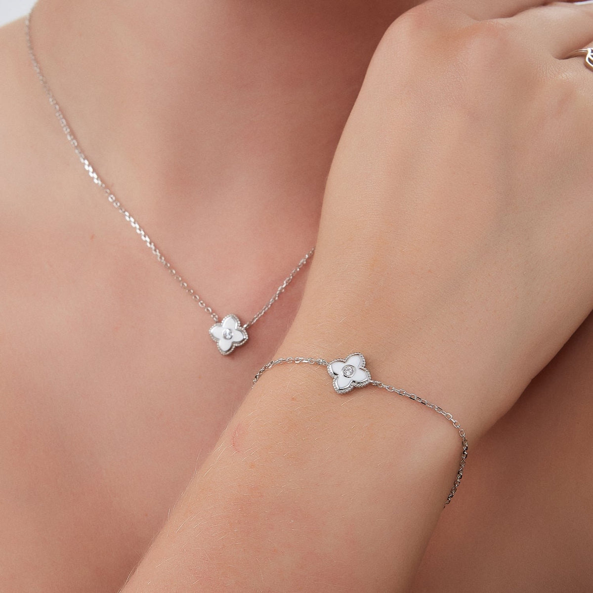 This set, which includes a necklace and a bracelet, is handcrafted from 100% sterling silver and features a white enamel four-leaf clover with a gemstone.