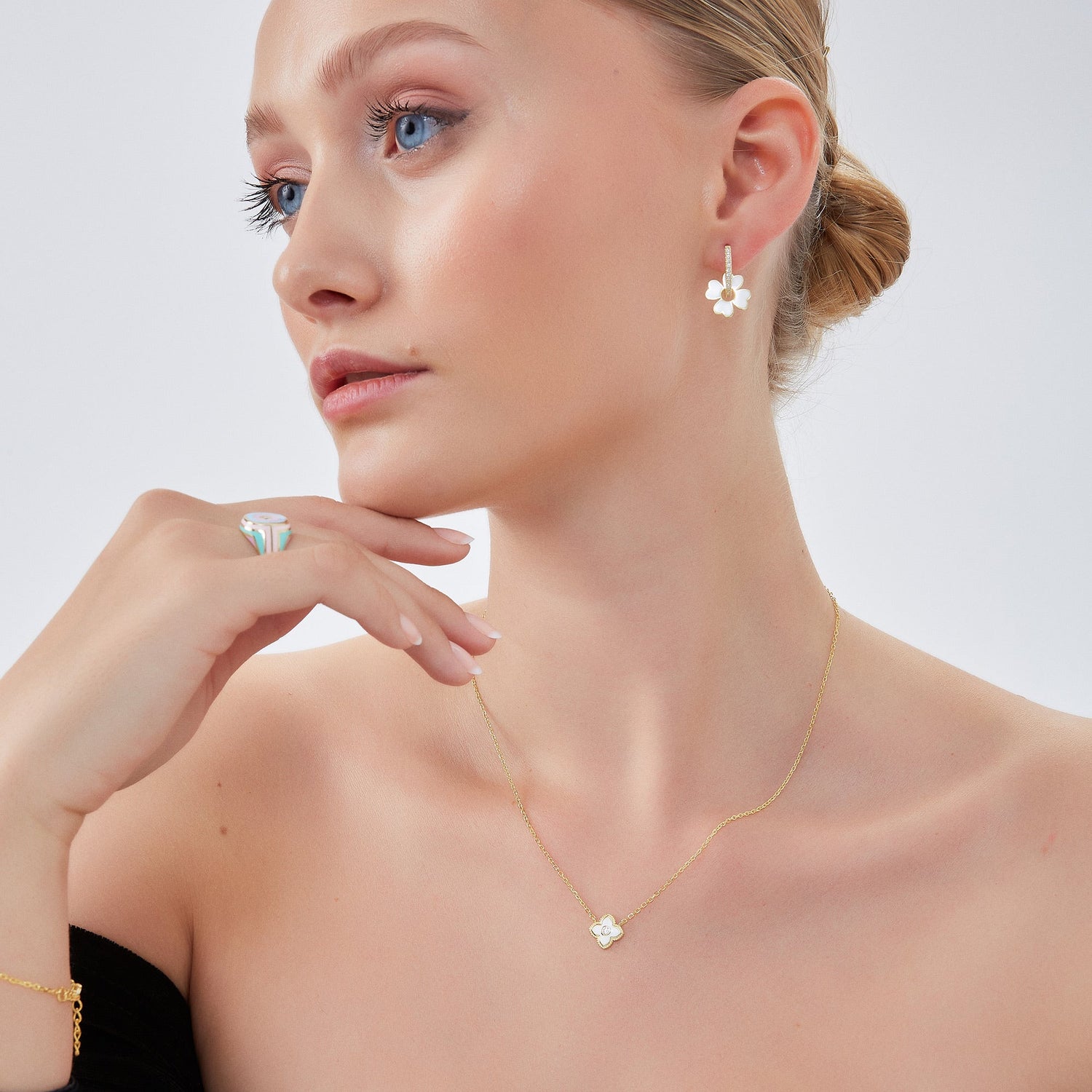 White Enamel Four Leaf Clover Necklace & Bracelet Set With Gemstone In Sterling Silver - Gold