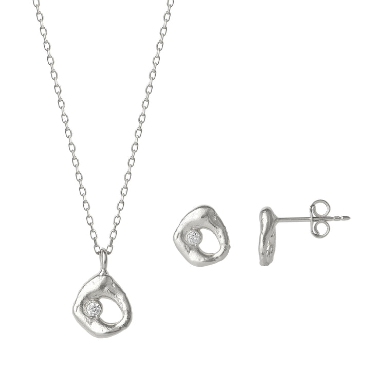 This set, which includes a necklace and earrings, is crafted from sterling silver. It features a natural textured, dripping molten design. Store in a dry, cool place.